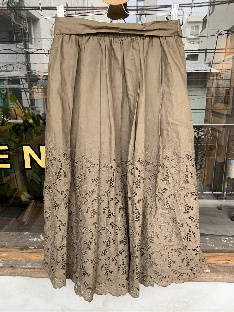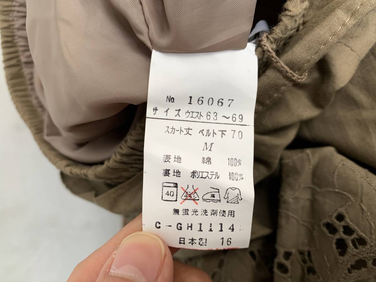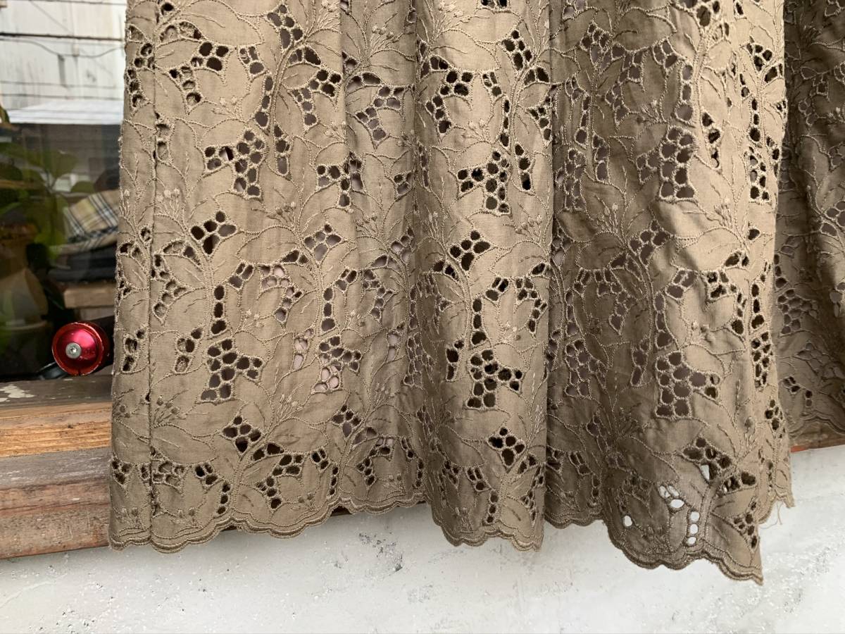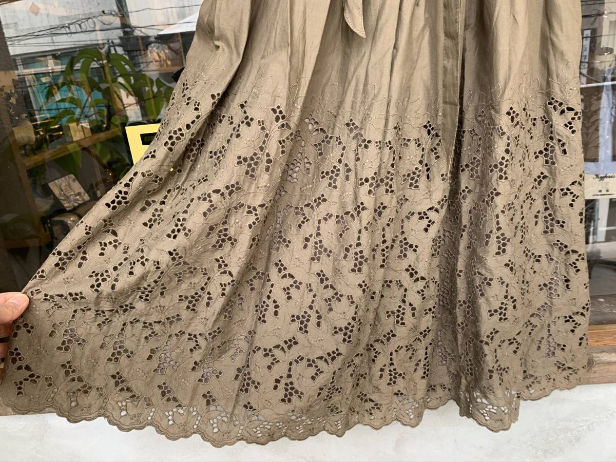 ★SS★カーキ★レース★ロング丈★フレアー★ギャザー★スカート★レディース★サイズM★ウエスト63-69cm★コットン★ベルト付★花柄★
