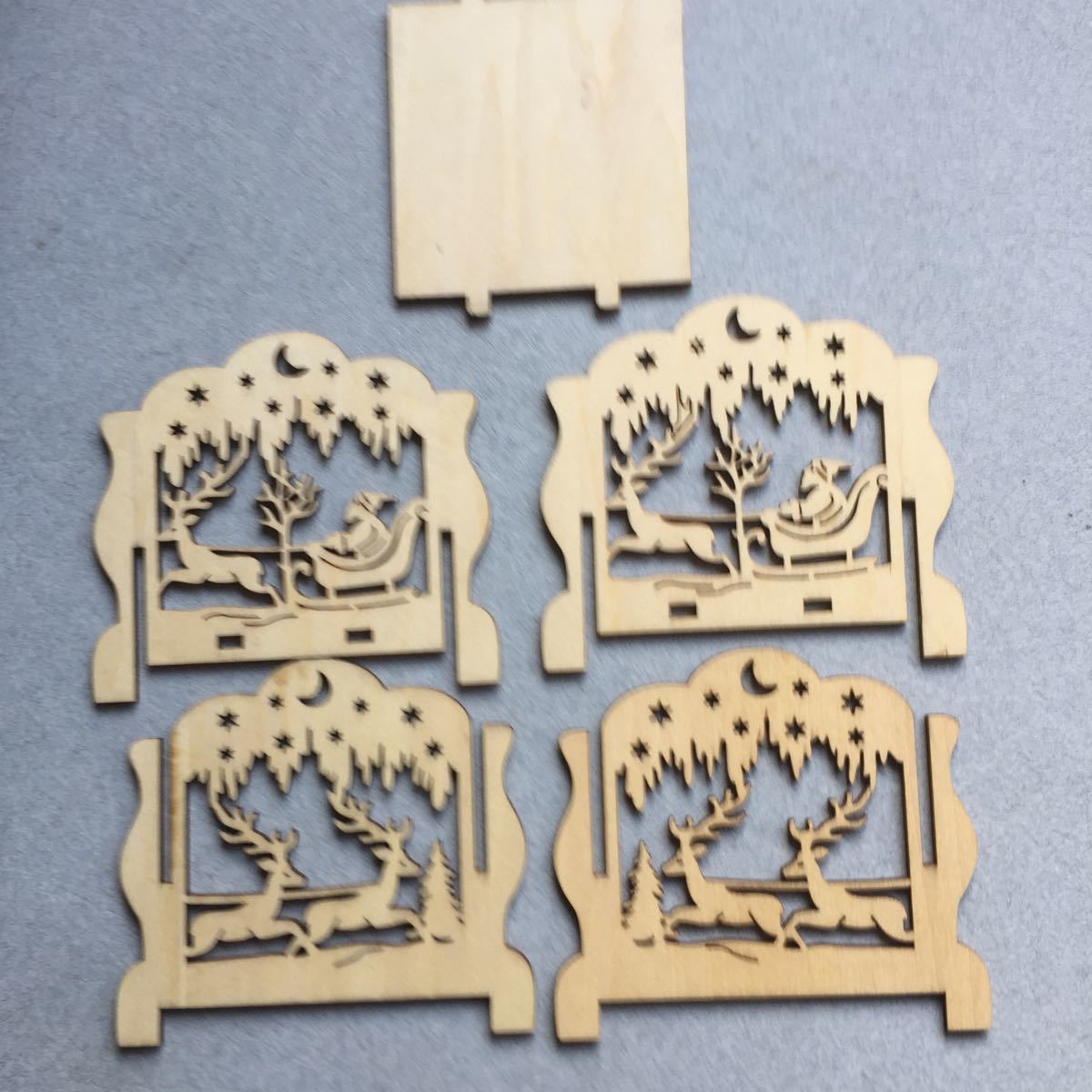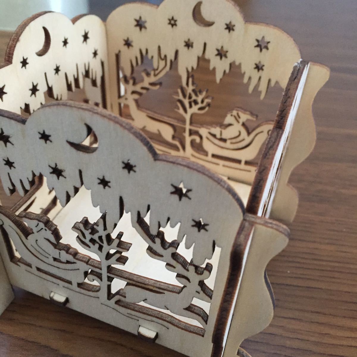 クリスマス飾りペン立ての商品の出品です。写真のように、5枚のパーツからできており、幼児でも簡単に組み立てられます。