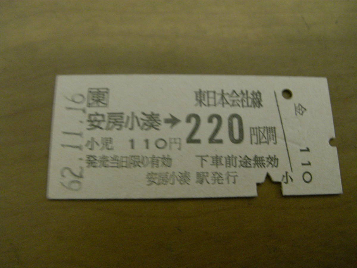 外房線 安房小湊→東日本会社線220円区間 昭和62年11月16日 安房小湊駅発行 JR東日本