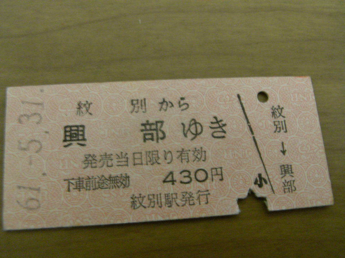 名寄本線 紋別から興部ゆき 430円 昭和61年5月31日