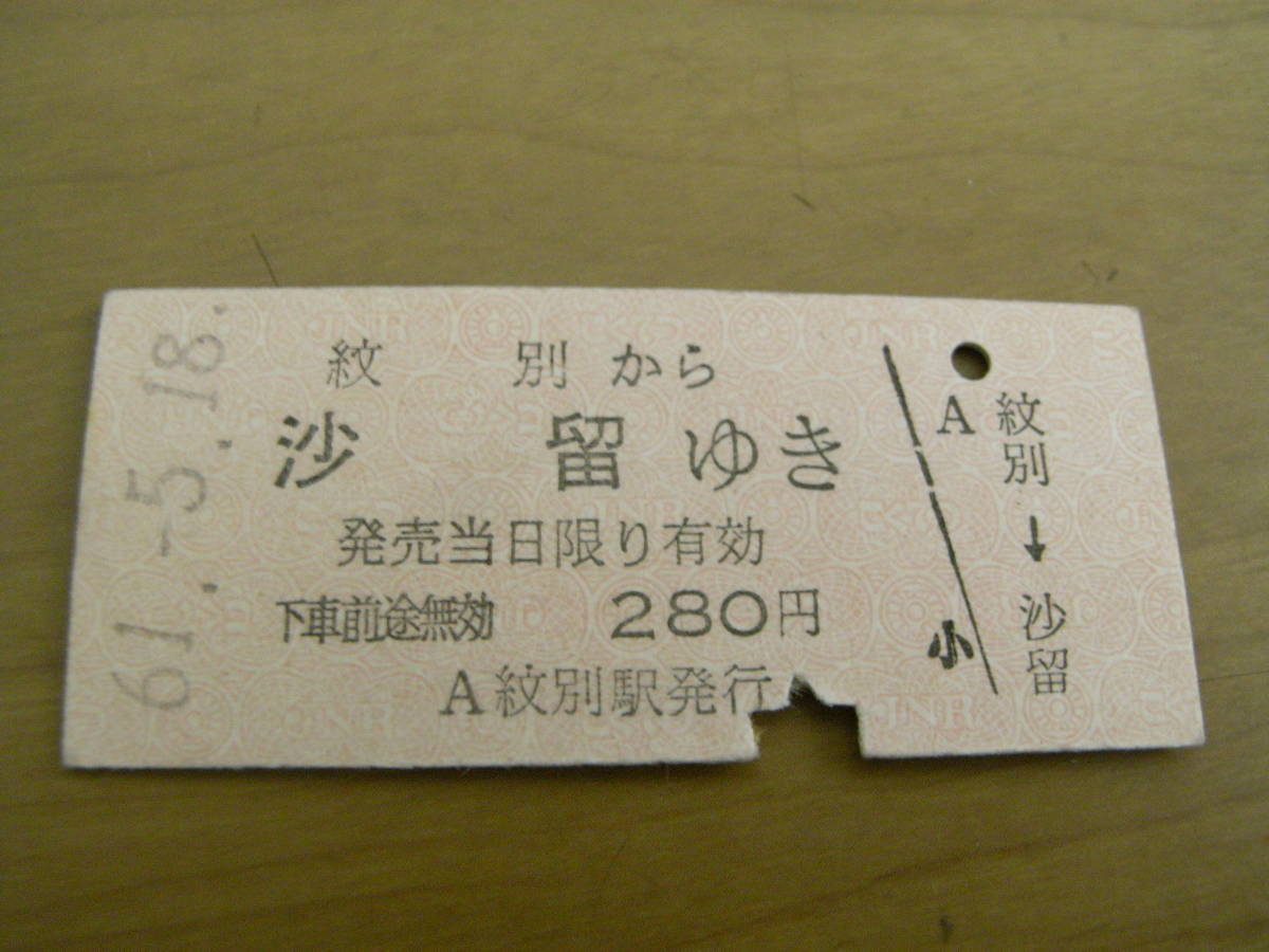 名寄本線 紋別から沙留ゆき 280円 昭和61年5月18日 紋別駅発行