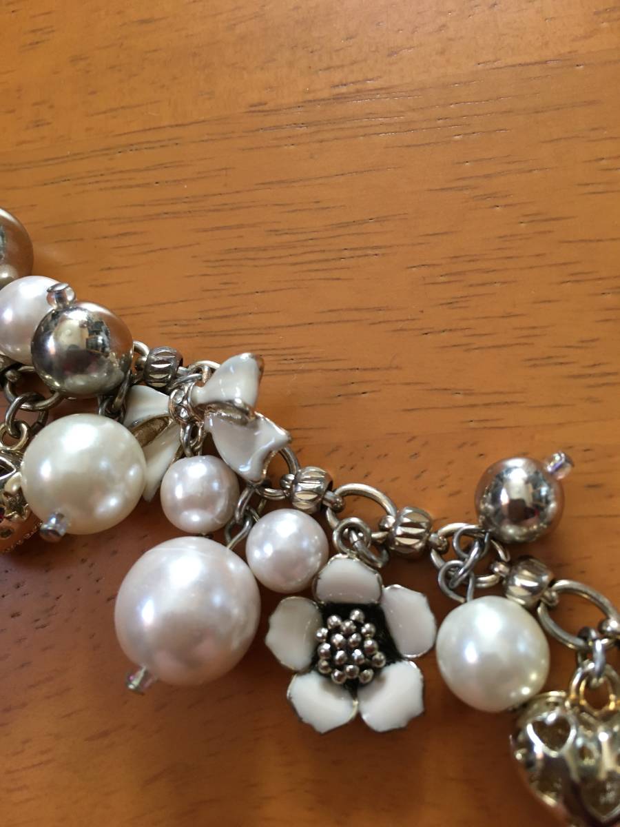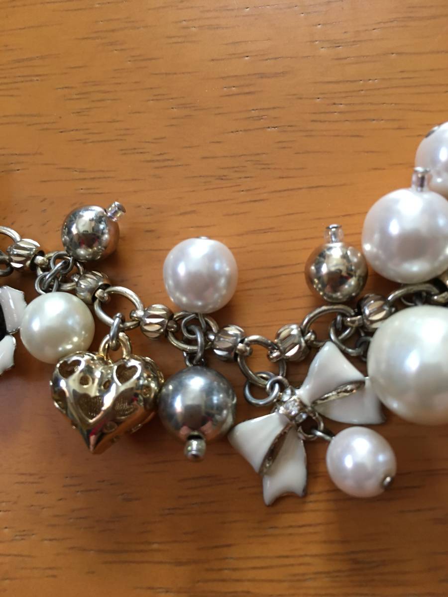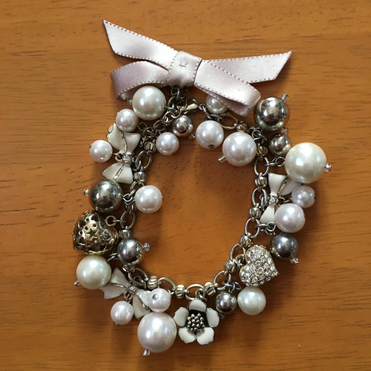 | JILLSTUART ブレスレット 中々見かけないデザインかと思います。 大、小パール、リボン、ハート、フラワーモチーフの華やかなブレスレット パールの色はピンクパールと 少し黄みがかったオフホワイトのような感じです 長さ 18,5センチ程 多少の誤差はお許し下さい。 フックタイプなので長さ調節できるかと思います。 2,3回の使用ですが、パールに小傷あり |