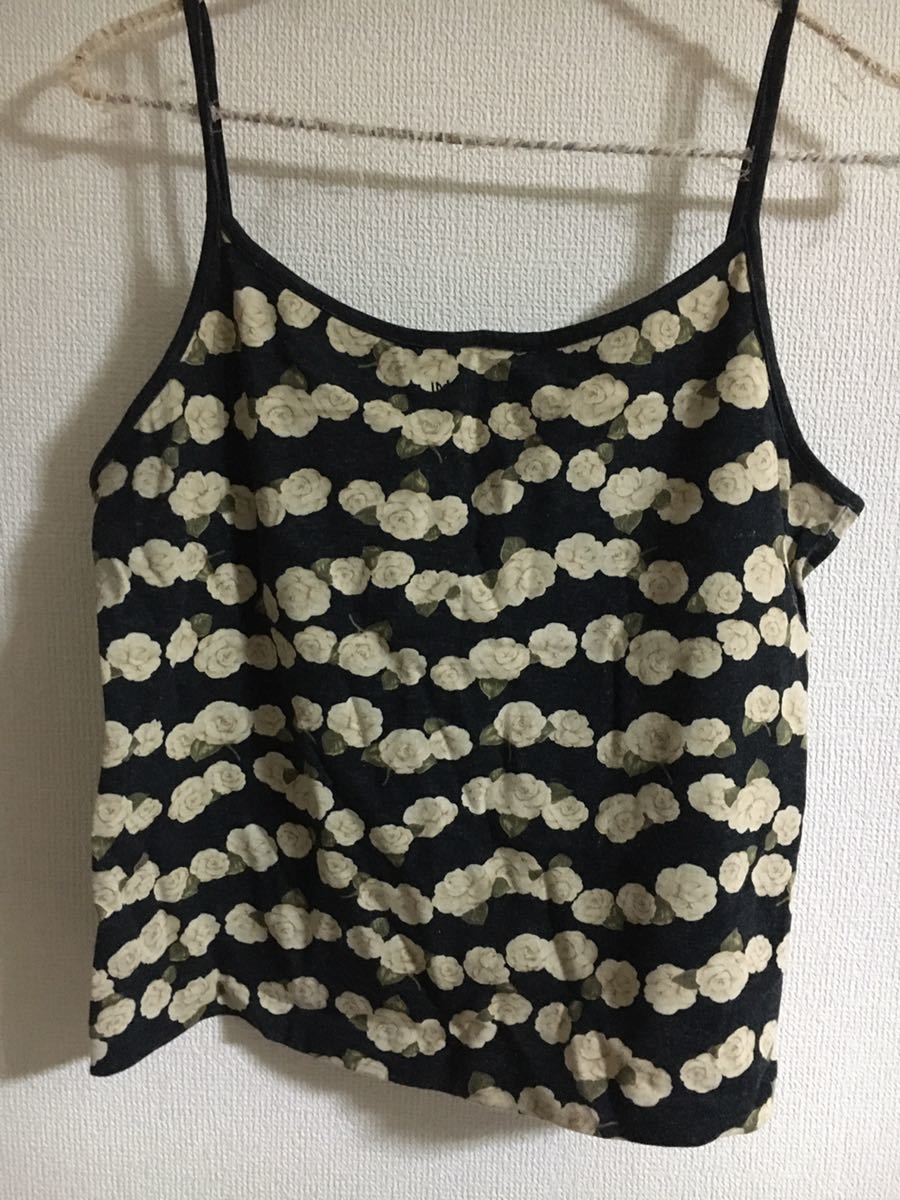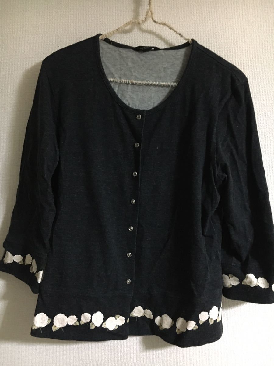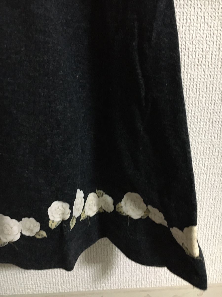 10年以上?前のお品です。サイズ表記は全てM(スカートのみサイズ表記なし)ですが、現在のLサイズくらいになります。綿100%、黒地にカメリアプリント、キャミソール、Tシャツの胸元にロゴ入り、カーディガンの前ボタンはカメリアです。大切に着たので特に難はないと思いますが、見落としがあればすみません。トレーナーとTシャツの中間くらいの厚みです。素材上、所々にネップ?ハゲ?感じはありますが、はじめからでした。スカート総丈85cm。