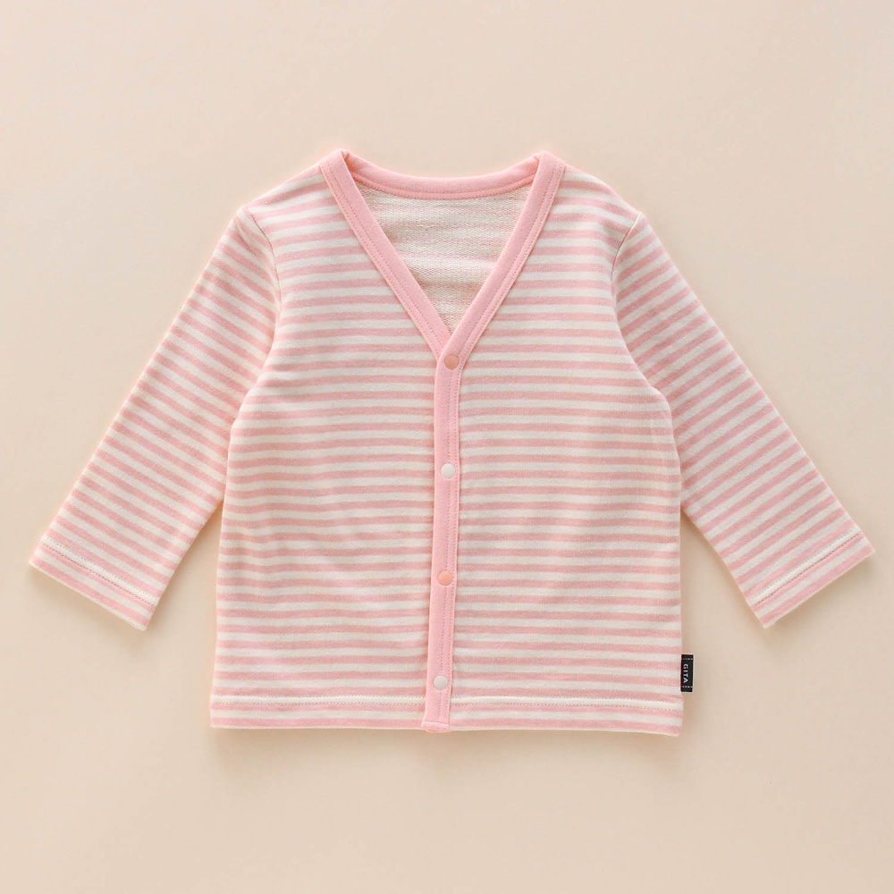 千趣会ベルメゾンのピンクのボーダーカーデガンです。 新品未使用 中身確認のためにビニール袋から出しました。 特に問題のない状態ですが、未開封品にこだわる方はご遠慮ください。 綿100%で肌触りがよいです。 肌寒いときのはおりもの、冷房対策などにどうぞ。裏起毛ですが、厚手ではありません。 すっきりシンプルなVネックカーディガン。ベーシックな色に加え、ボーダー柄が新登場。やわらかくて肌にやさしいミニ裏毛素材で、肌寒い時期から着られます。スナップボタンは交互に色が違い、お着替えの時も留め間違いにくい工夫が。通園服にお役立ちのお名前スペースは2枚付きで、お下がりの時にも便利です。 (90)身丈38 ●前:中央スナップボタン留め ●(カットソー)綿100%(ミニ裏毛)