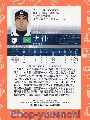 ◇2003◇BBM◇688◇ナイト◇セカンドバージョン◇レギュラーカード◇複数落札まとめて依頼対応◇クリックポスト(追跡可)185円発送◇