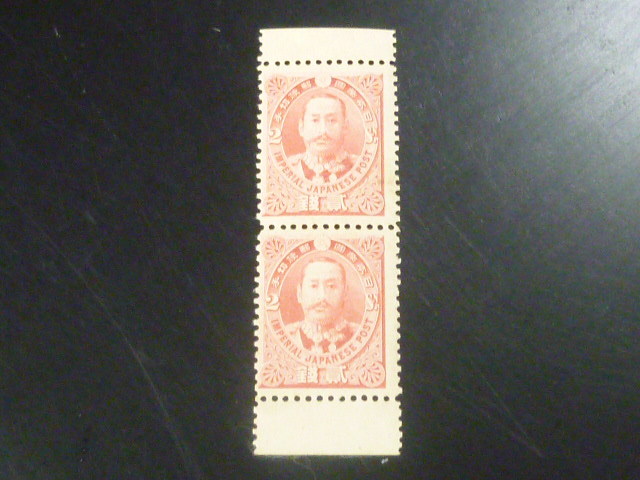 19 S 日本切手 1896年 記3C 日清戦勝 2銭 有栖川 縦ペア 上下マージン付 未使用NH