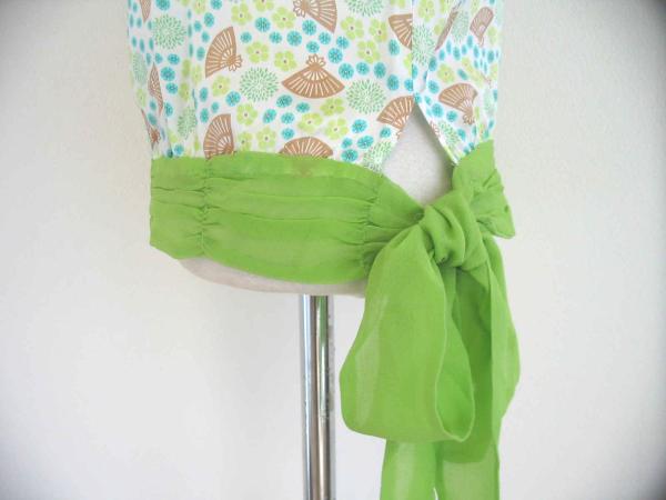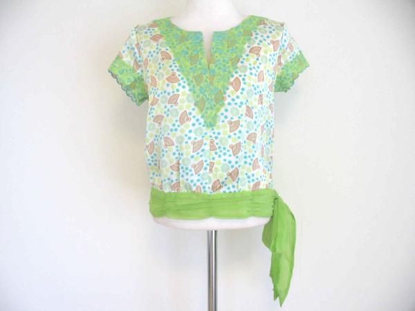 ★お値下げ★新品★グリーンシフォンリボン扇小花柄サテンブラウストップ