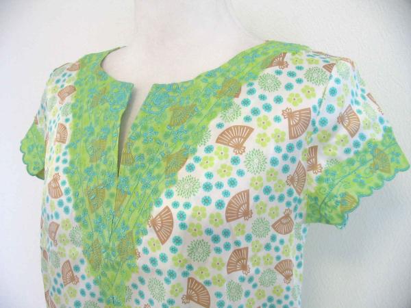 白地にグリーン・ブルー・ベージュの扇と小花の模様がキュート。