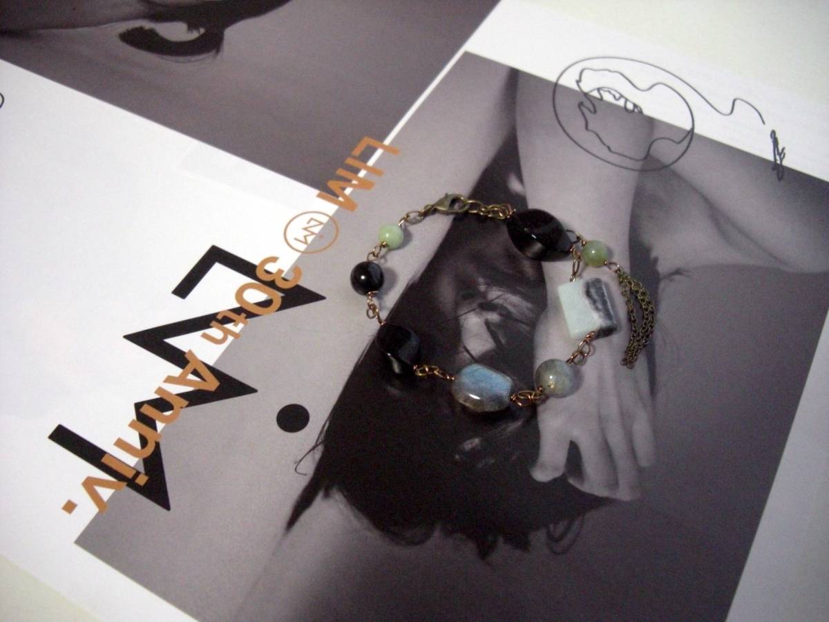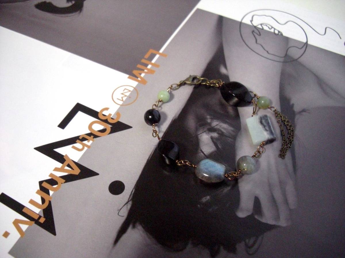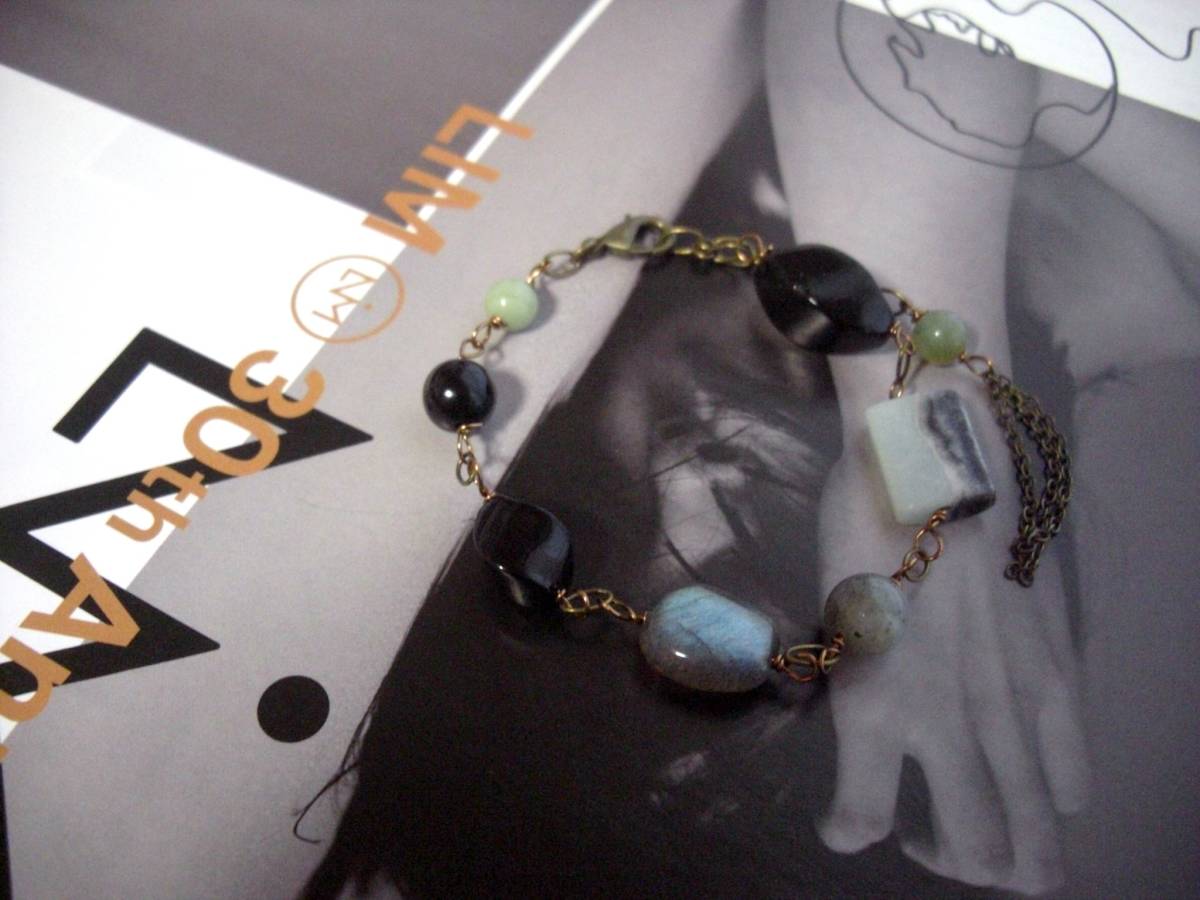 夏色・見本帖・・シリーズです♪物憂げなアマゾナイトとラブラドライト・・神秘的なアマゾナイトとラブラドライトのブレスレットです♪6ミリの丸玉や14ミリのスクエアのアマゾナイトに丸玉やツイストのオニキスにシラー輝くラウンドカットやラフタンブルのラブラドライトを合わせました♪長さは全長22センチ位で調節自由です♪お揃いのシリーズも 出品しています♪シ ンプルで合わせやすいデザインを考えて作りました♪ハンドメイドをご理解いただいてノーリターン、ノークレームでお願いします♪