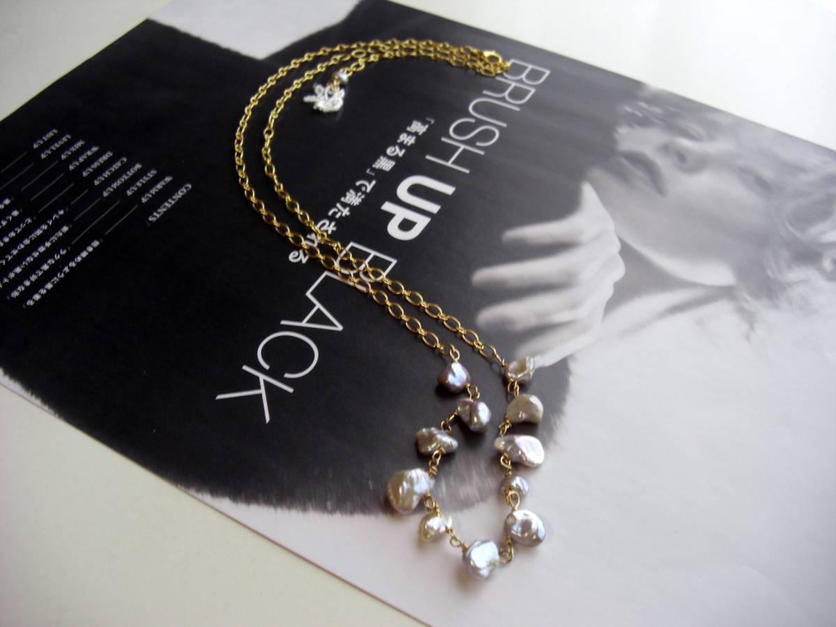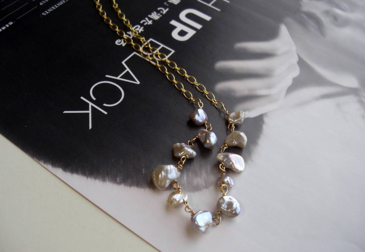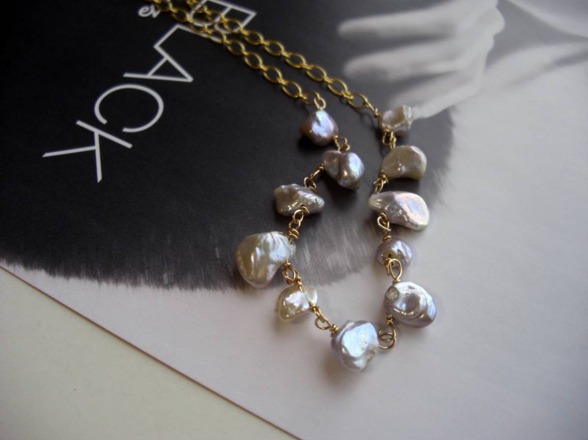 夏色・見本帖・・シリーズです♪芥子パールと綿レースと・・ロマンチックを集めて・・可憐な綿レースとパープルピンクの芥子パールのネックレスです♪花びらのような芥子パールを集めて可憐な表情です♪11ミリから14ミリ位までの芥子 パールはデザインチェーンに繋ぎました♪長さは全長75センチ位で調節自由です♪お揃いのシリーズも出品しています♪シンプルで長 く着けていただけるデザインを考えて作りました♪♪ハンドメイドをご理解頂いてノークレーム、ノーリターンでお願いします。