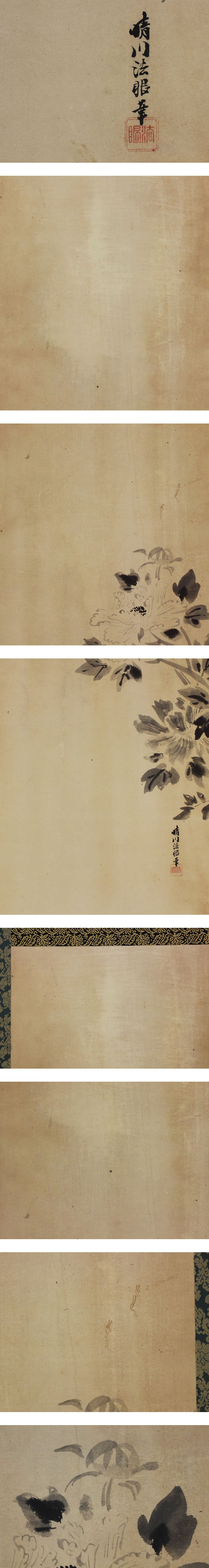 狩野晴川院 かのう-せいせんいん (1796-1846) 江戸後期の狩野派の画家。木挽町狩野第七代。江戸生。栄信の長男。養信は名、号は会心斎・玉川、通称は庄三郎。画法を父に学ぶ。文政2年法眼に叙せられ、家督を継ぐ。後法印に進み、晴川院と称する。弘化3年(1846)歿、51才。 本紙は、染み痕、擦れ痕、ヤケがあります。 表装は、表装依頼し改装しましたので新品同様です。 【サイズ】 作品 横約28cm×縦約92.5cm 表装 横約39.5cm×縦約176.5cm |