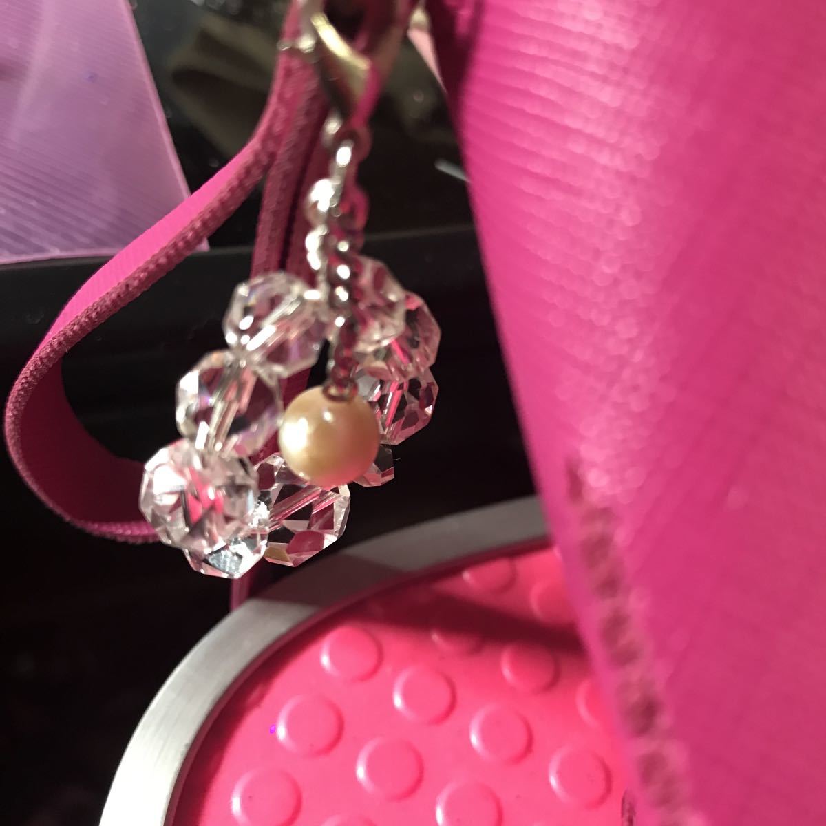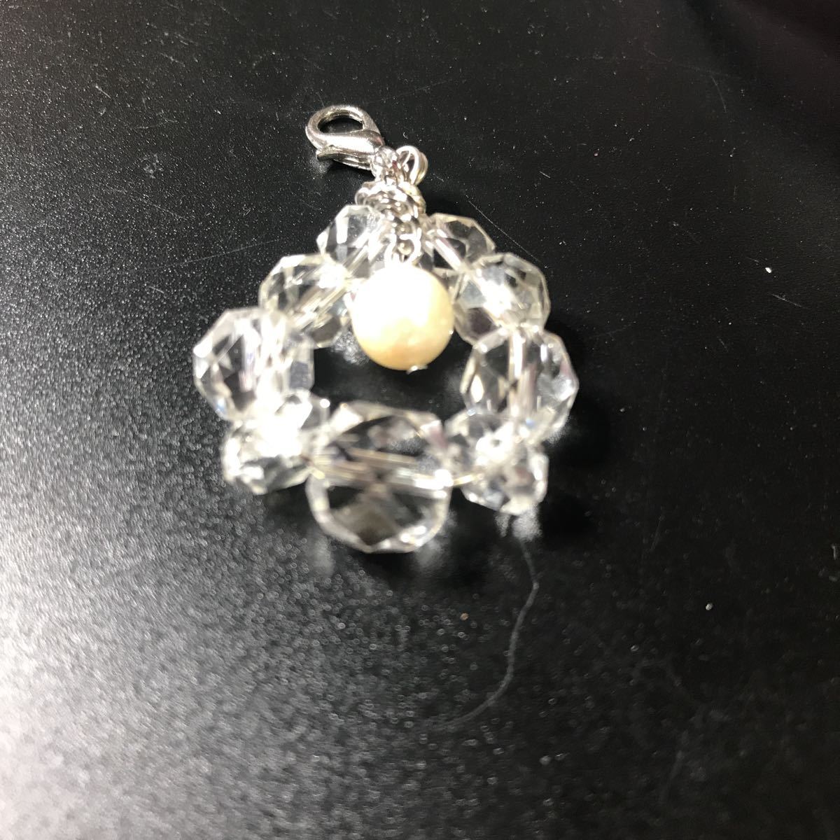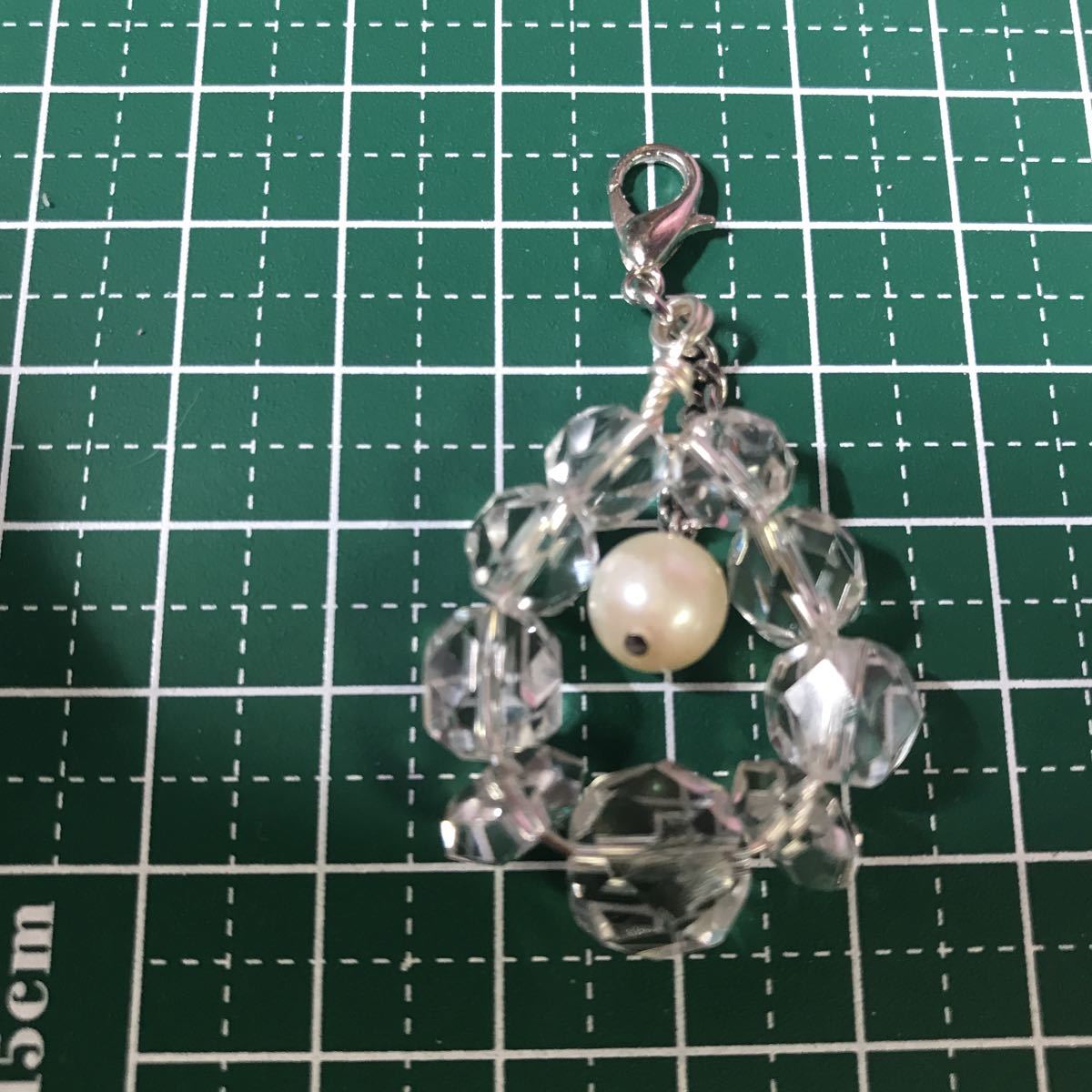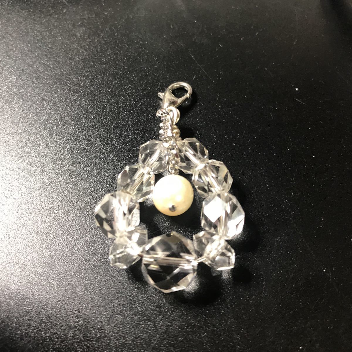アコヤ真珠は8ミリあります。大きさの違うカットクリスタルが涼しげでアコヤ真珠の白さを引き立てています。こちらのアコヤ真珠天然ならではの傷等ございます。アクセサリーにするにはちょっとという感じですのでストラップにしました。