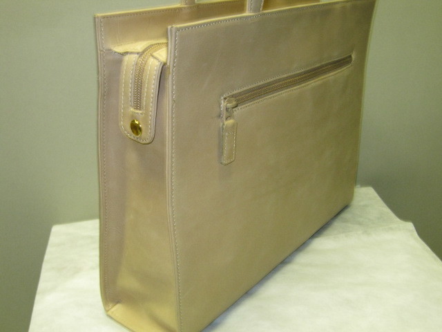 サイズ よこ37 たて28 マチ9 重さ730g  ショルダー長58立上り26 斜めに線が入ったデザインです。 天ファスーでA4サイズの書類などが入ります。 中はベージュの布地でファスナー、オープン、携帯の3つポケットがあります。 前胴にポケットがあり、背胴にもファスナー付きのポケットがあり使いやすいです。 女性のビジネス用として最適です。ソフトな肌ざわりの牛革で私が作りました。 これからの季節に最適でおすすめ品です。bDIV>