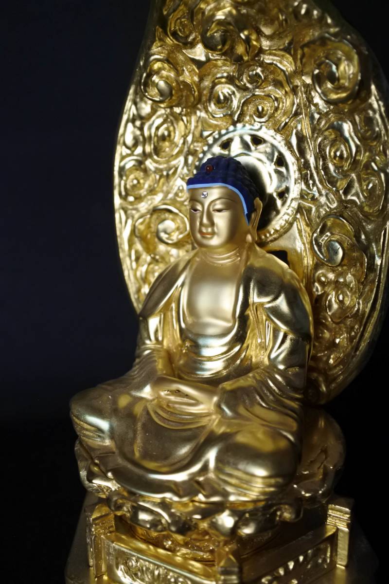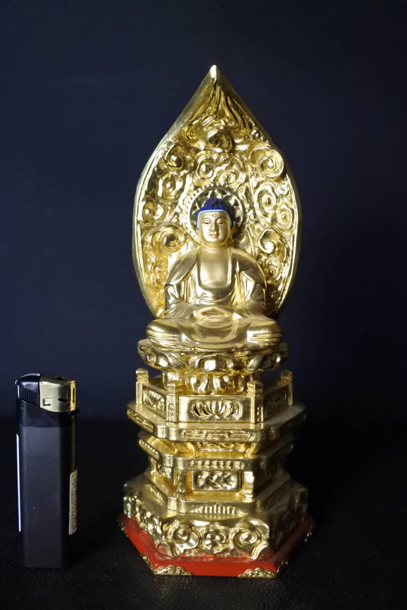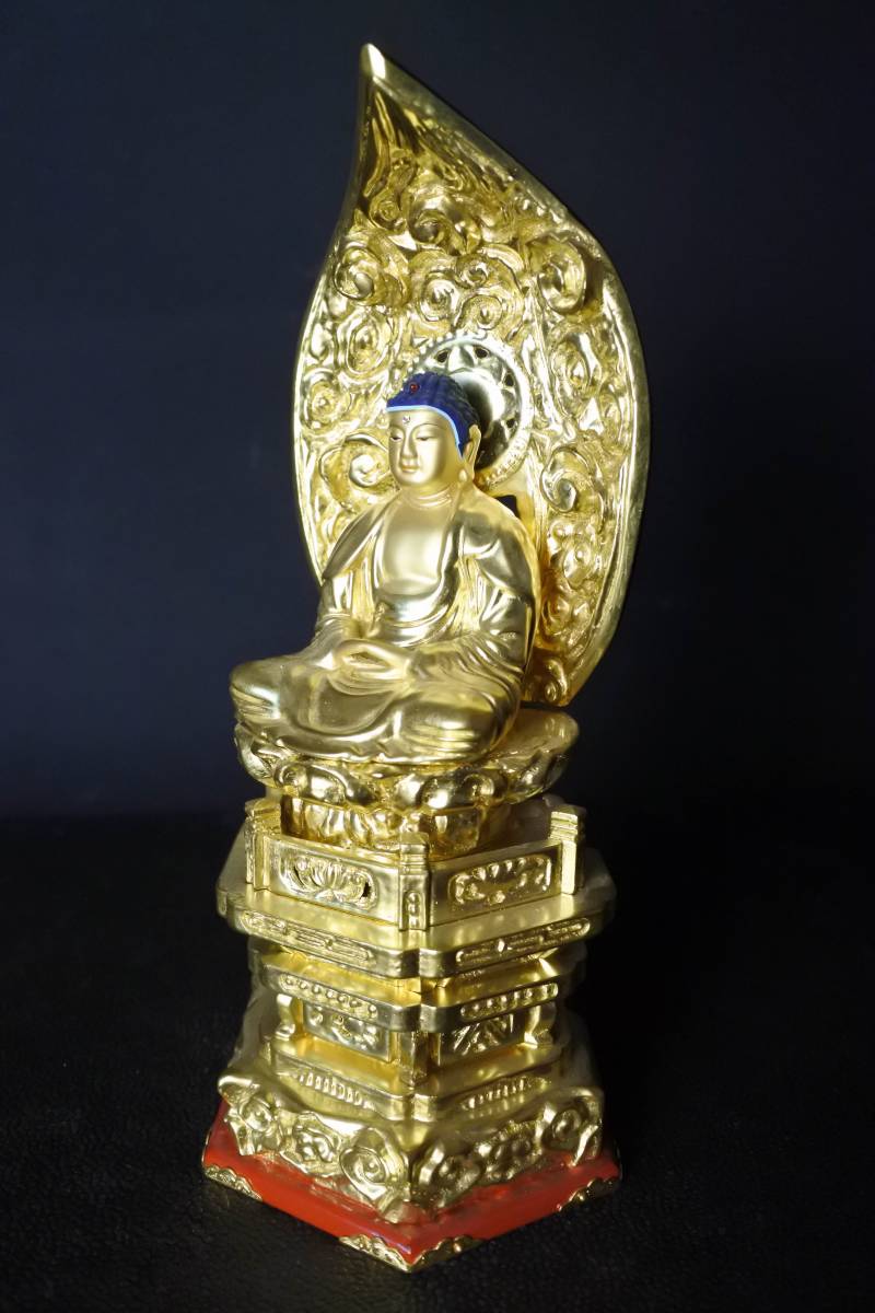 未使用保管品 総金箔 粉 座釈迦 木製 二号です。 肌は本金粉です。 高さ23.5㎝ 幅10.1㎝ 奥6.6㎝ 仏像高さ7.5㎝ 光背裏部分に少し汚れがありますが、正面からは見えません。 |