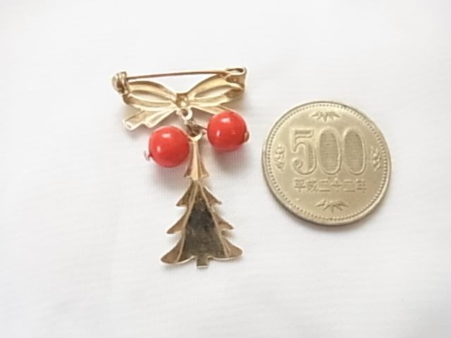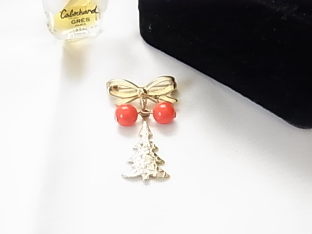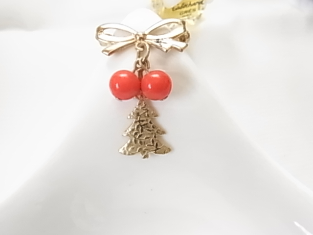 キュート りぼんに赤いビーズ玉 クリスマスツリーも揺れて可愛らしい 小ぶりのブローチ▲