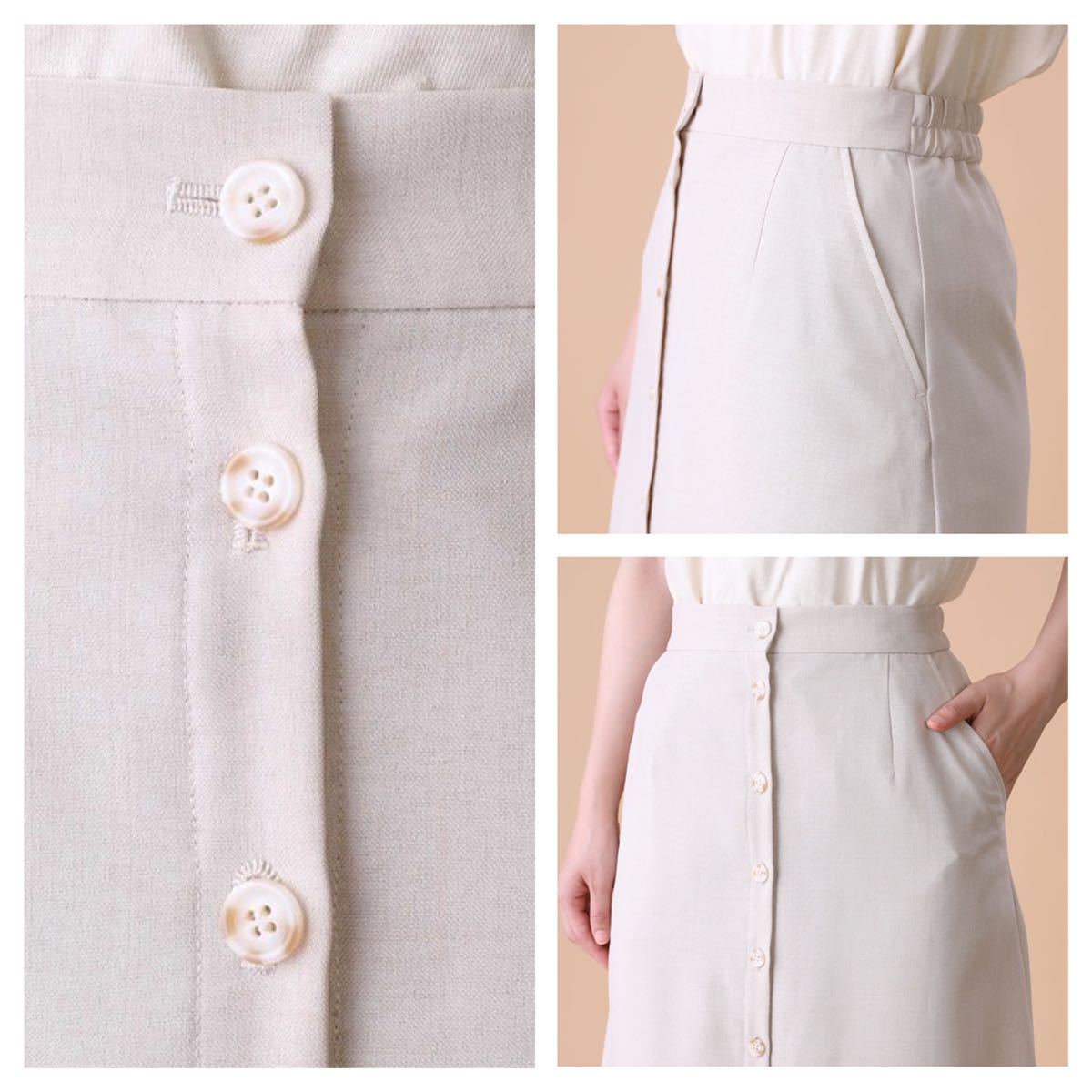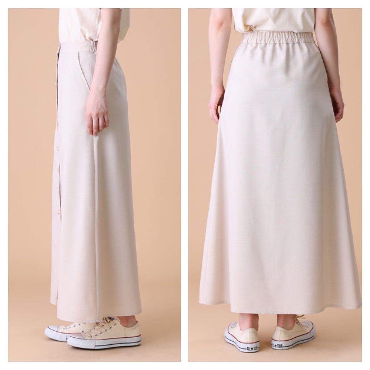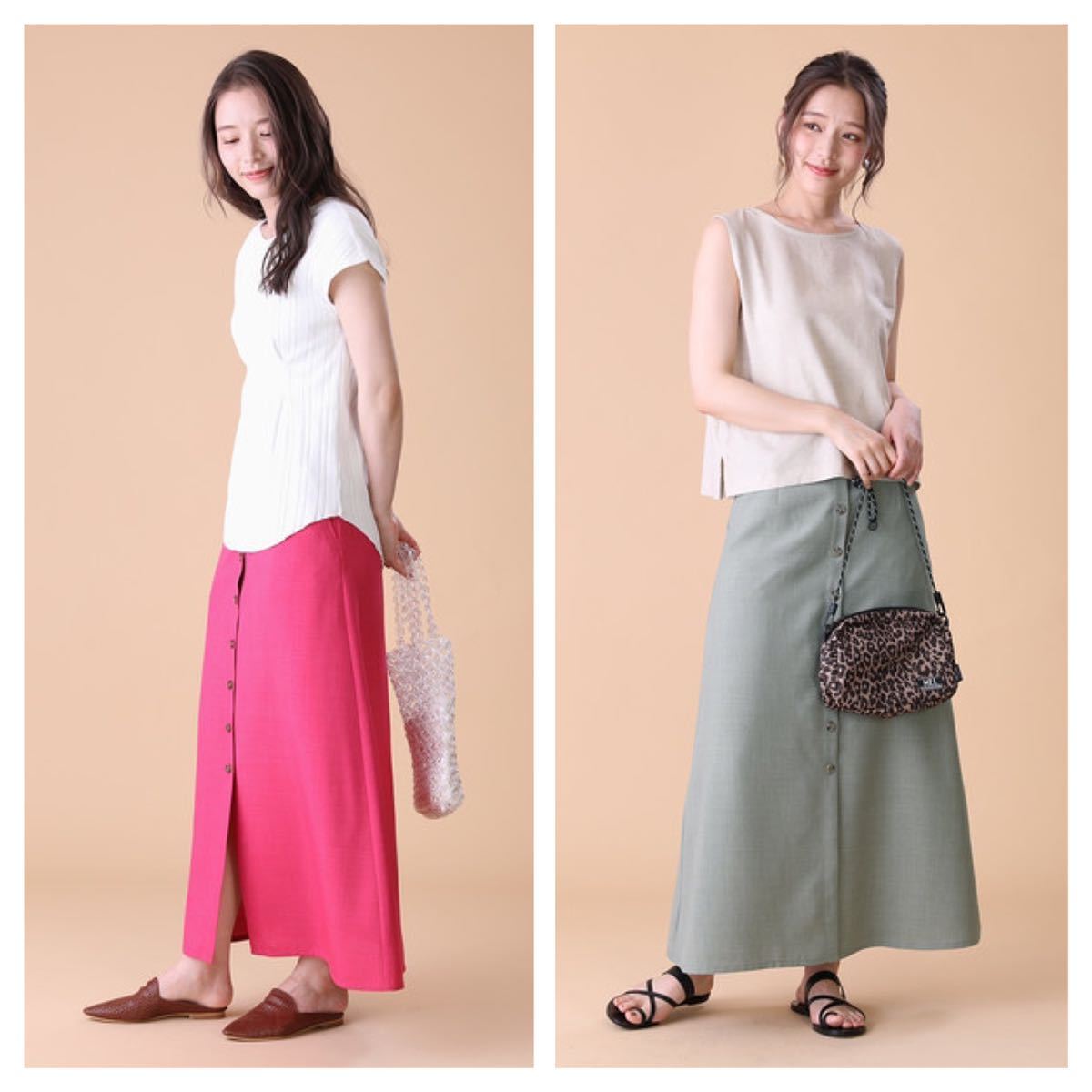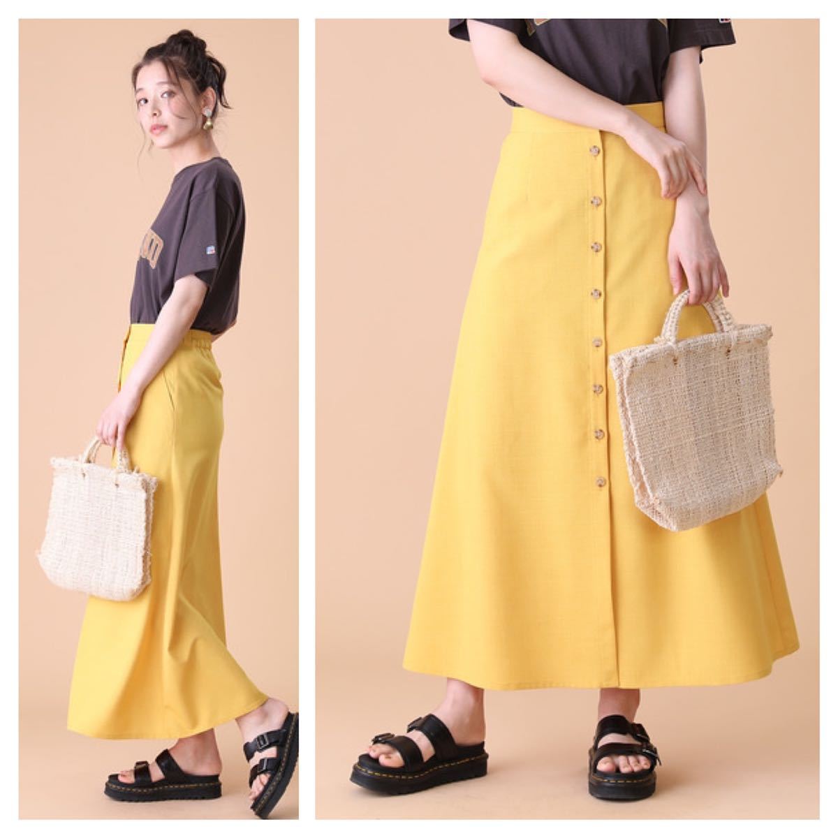コーディネート今年大注目のフロントボダンスカートは合わせるアイテムでキレイめにもカジュアルにも決まるデイリーユースしやすいデザイン。