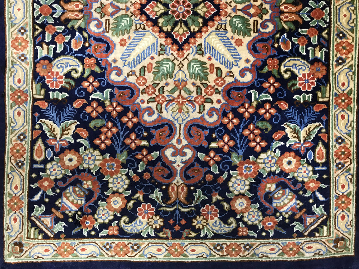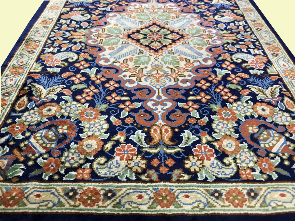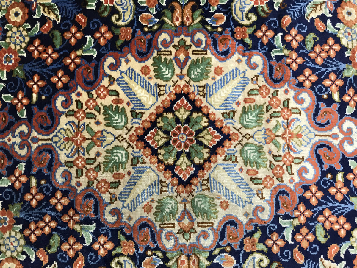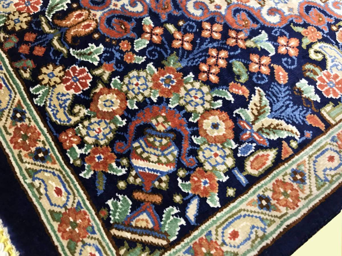 こちらの絨毯は、クム産の高級シルク100%の手織り絨毯です。