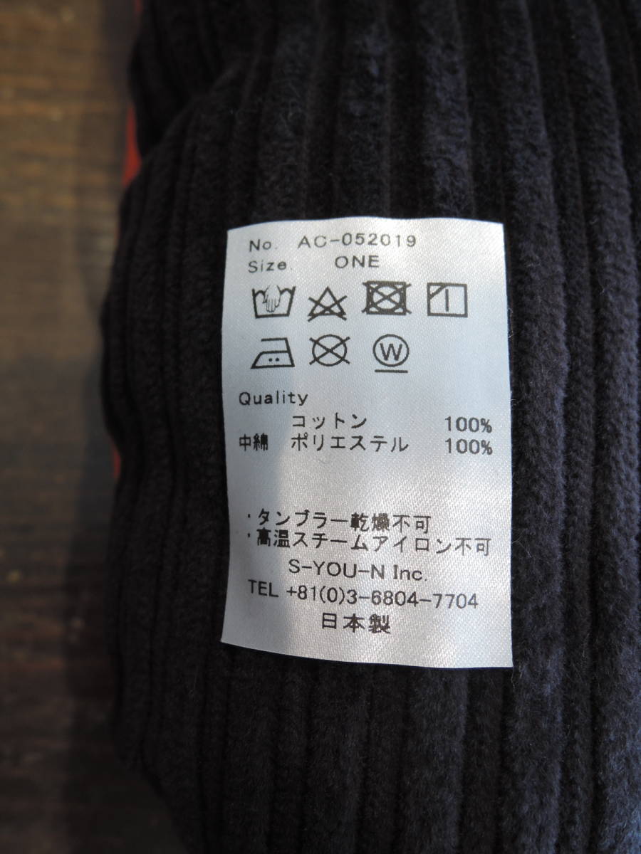 片面はキャラクター、もう片面は無地で太ウネのコーデュロイ風の切り替えしになっています。