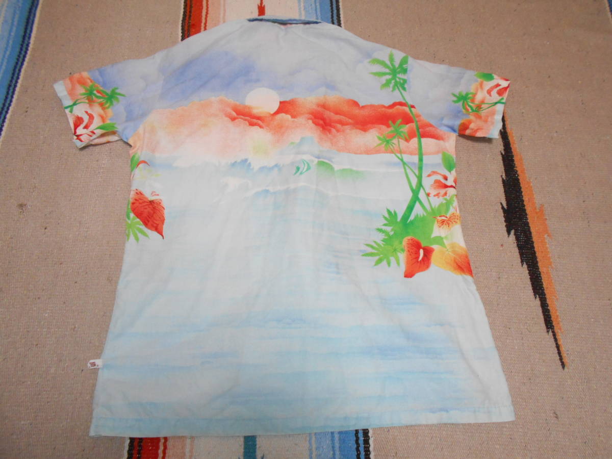 西海岸カリフォルニアの歴史あるサーフブランド 「HANG TEN」 1970年代製 パームツリー × ハイビスカス × パーフェクトサーフブレイクす  トロピカル オールドサーフ柄 アロハシャツ