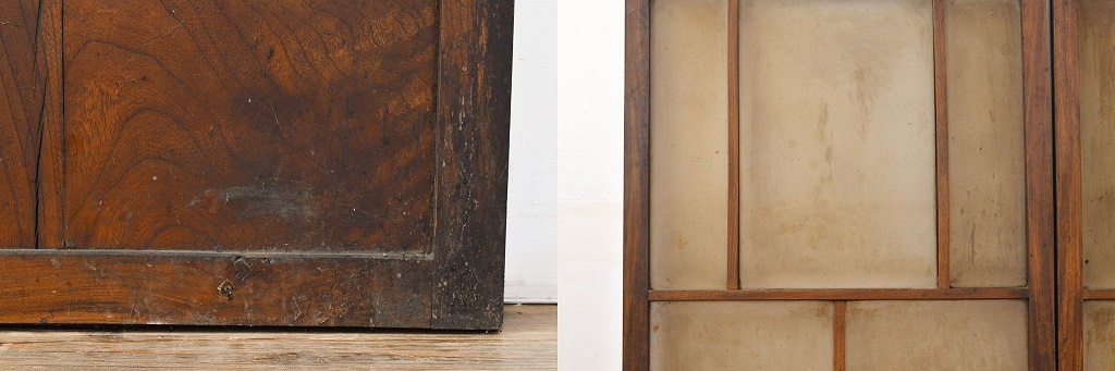 R-051168 アンティーク建具 昭和初期 激レア!昭和レトロな雰囲気を醸しだす総ケヤキ材製のガラス戸2枚セット(引き戸)(R-051168)