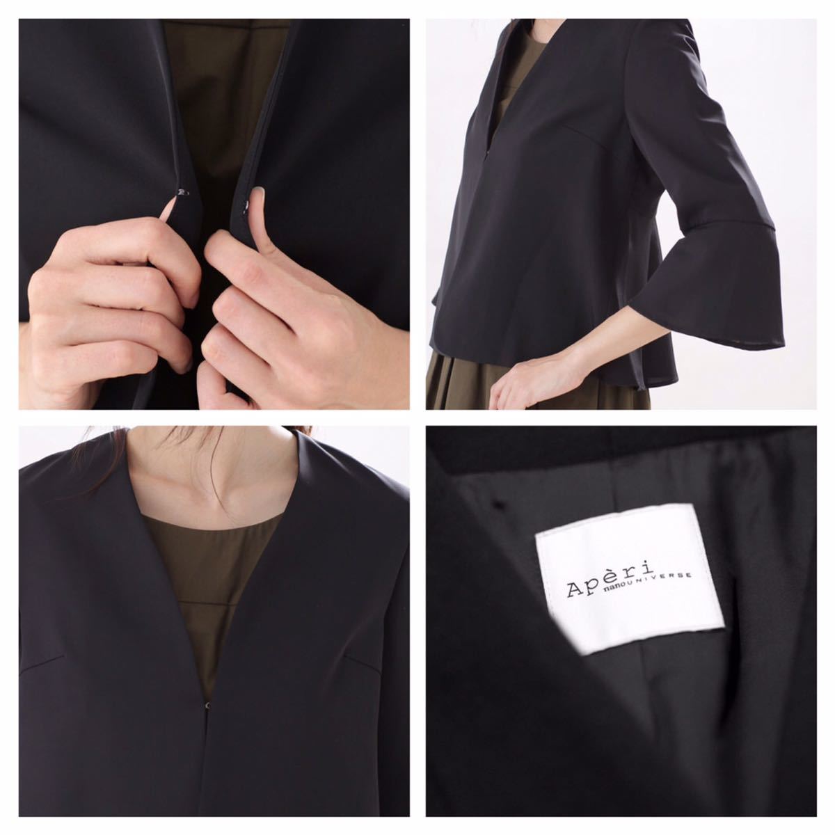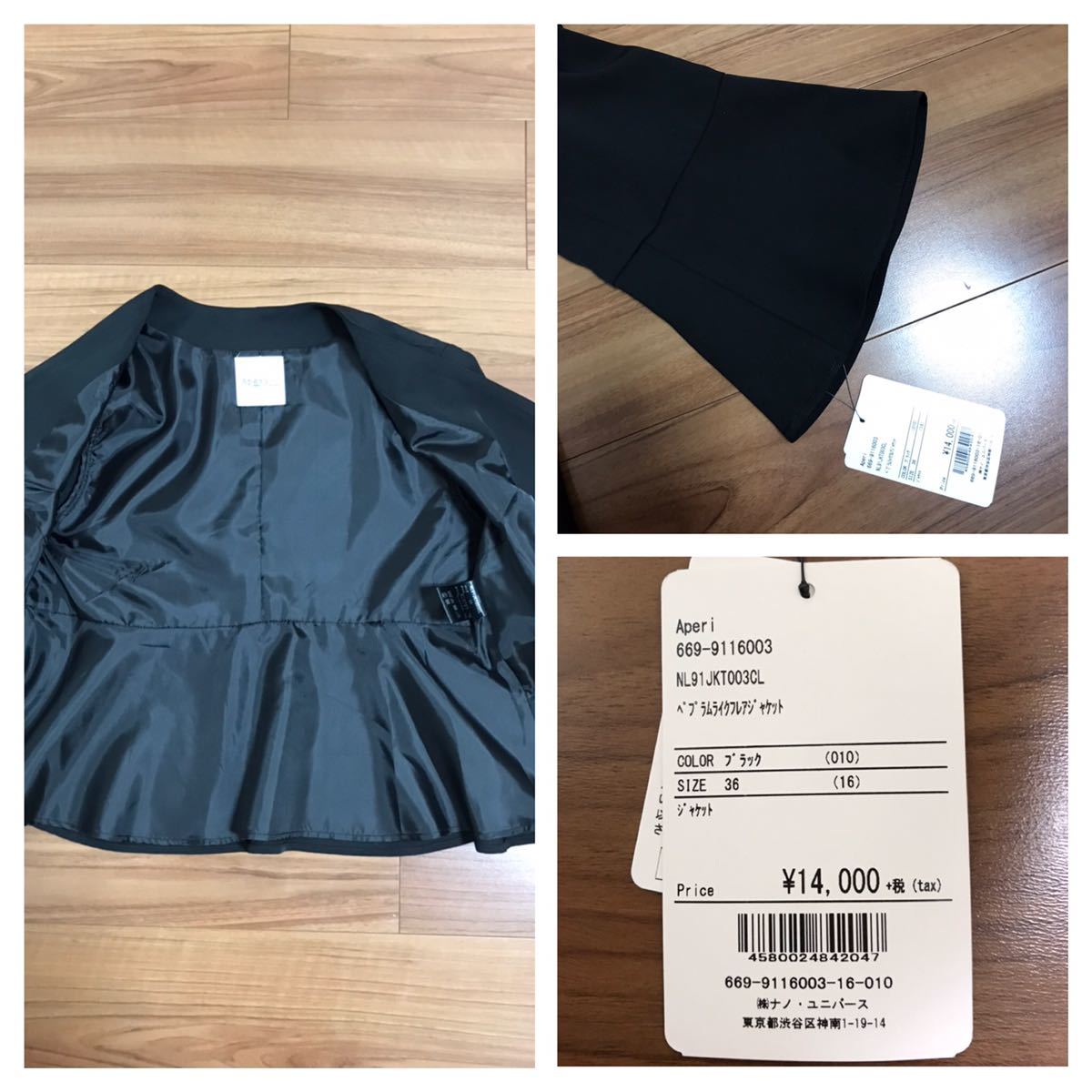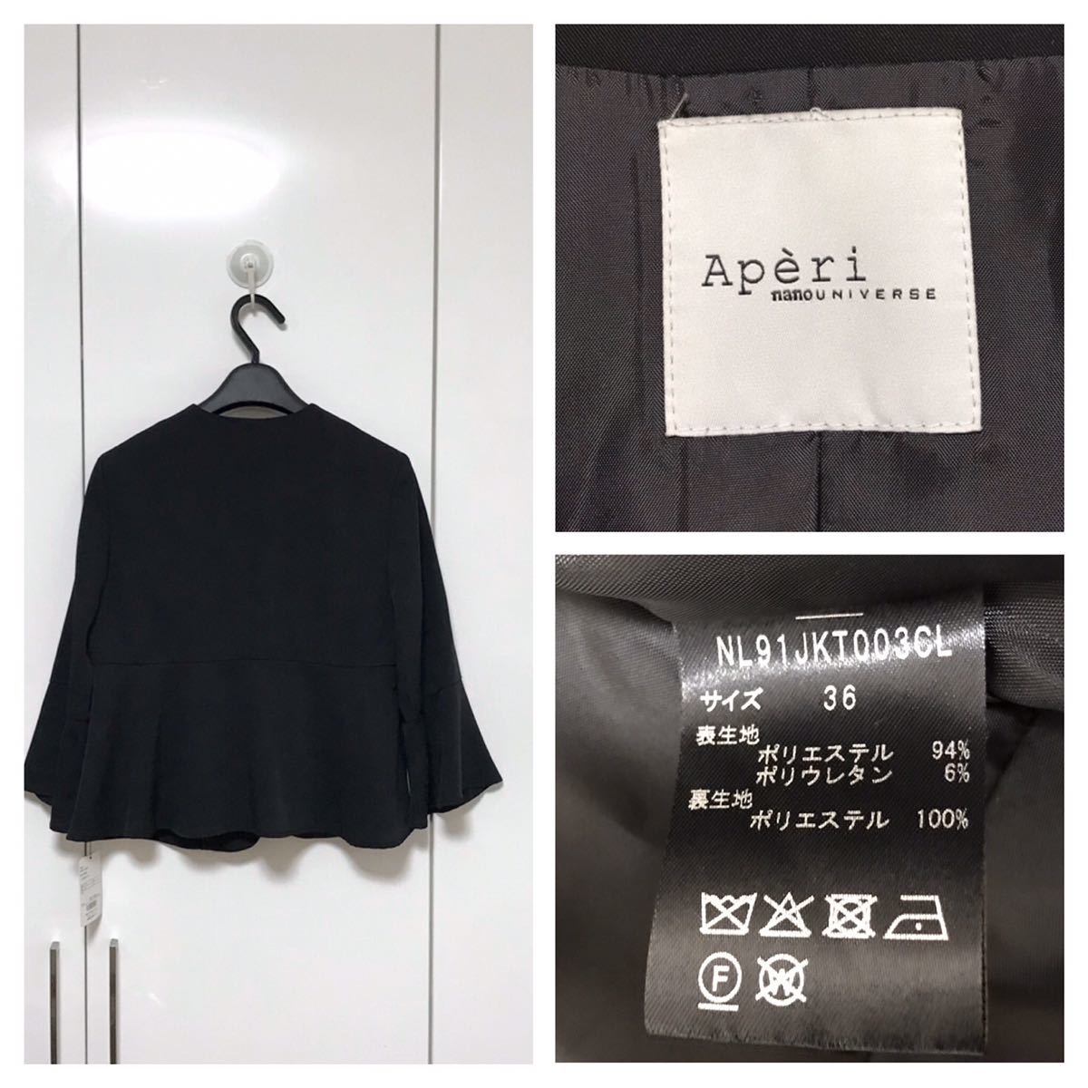 ナノユニバースのAperi/ペプラムライクフレアジャケット、タグ付きの新品です。保管上の汚れやダメージはありませんが、クローゼット保管ですので神経質な方はご遠慮ください。