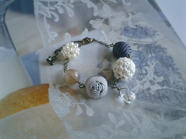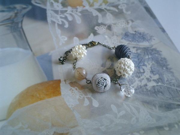 パリの屋根裏部屋シリーズです♪柔らかいオフ・ホワイトとグレーのイメージでシックなブレスレットを作りました♪トップには12×9ミリ位の水晶のドロップ、17ミリの編みボールや16ミリのサテンボール、16ミリの薔薇のボタン、16ミリ位の淡水パールボール、アンティークの樹脂ビーズを集めてひたすらシックにまとめました♪長さは全長22センチ位で調節自由です♪♪パリの屋根裏部屋をイメージして作りました♪シンプルで飽きのこないいつまでも着けられるデザインを考えて作りました!お揃いのネックレスも出品しています♪ハンドメイドをご理解頂いてノークレーム、ノーリターンでお願いします