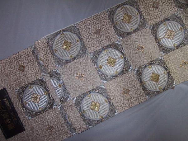 格調高い訪問着にどうぞ!帯です。おもに訪問着用六通柄袋帯です じゅらく 黄金繭ブランド 西陣六通柄帯(黄金繭は太鼓部と前腹部に一部施されています) 絹100%金属糸等使用   新品み仕立て品 薄クリーム地。