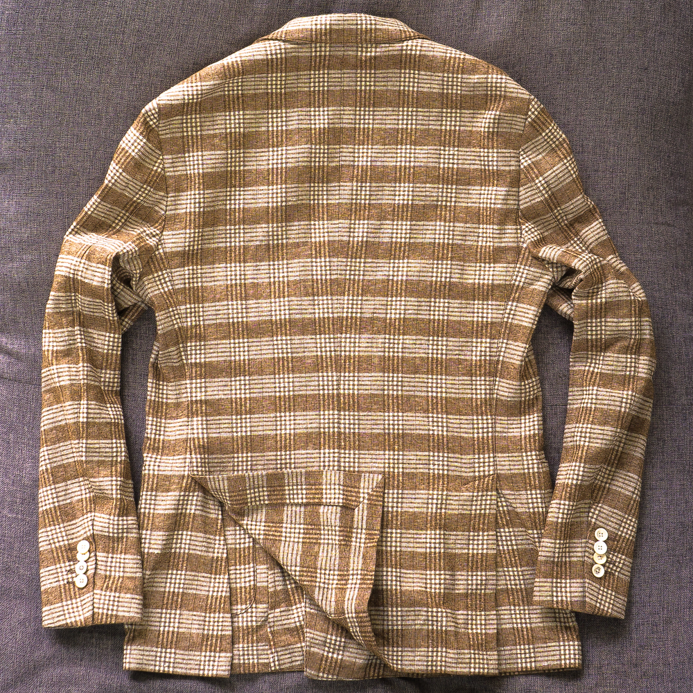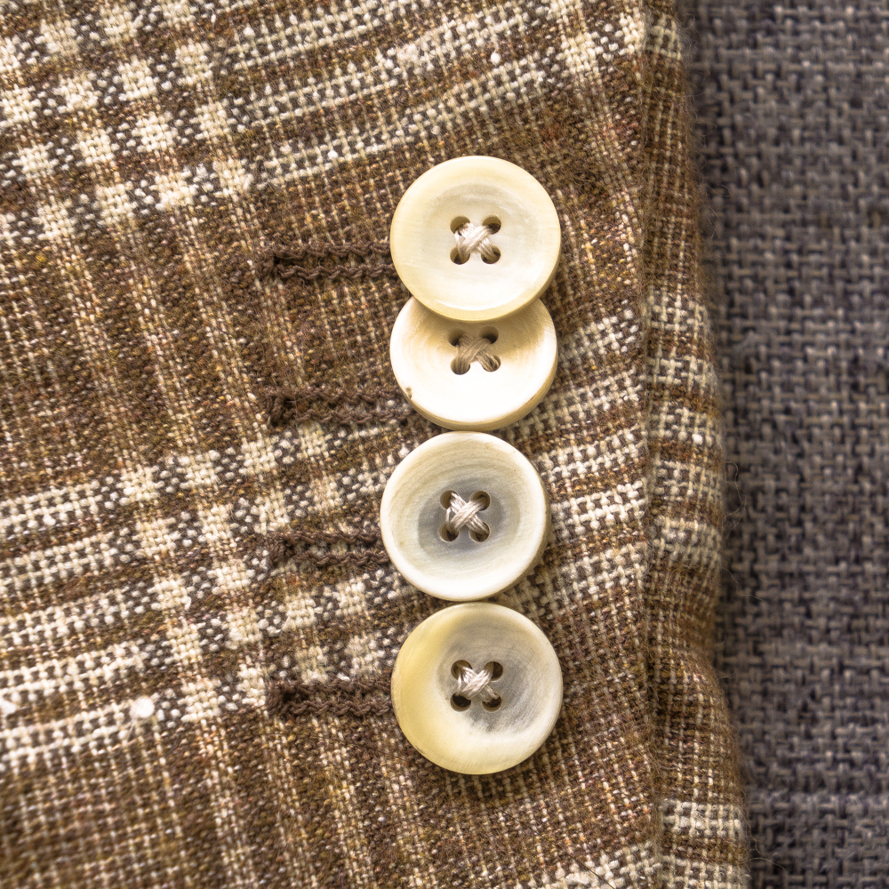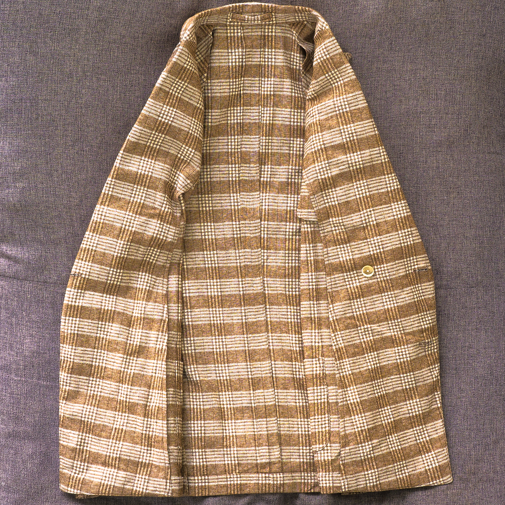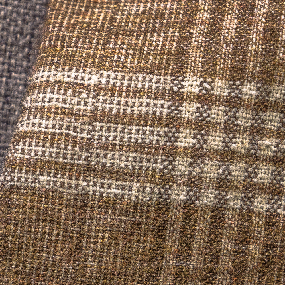 素材はコットン42%、ビスコース18% ナイロン14%、シルク13%、リネン13%の5者混紡素材。リネン混なので素材の表情にラスティック(粗野)感があるものの、コットン、シルクのきれいさが絶妙にミックスされています。