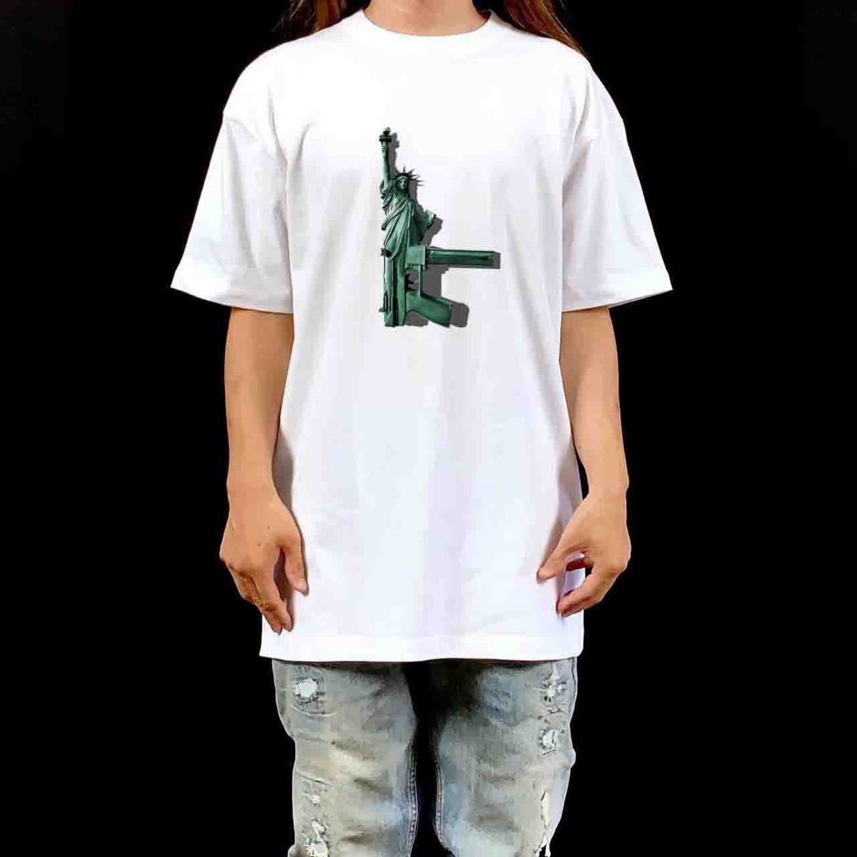 アメリカ、ニューヨークの象徴的な自由の女神をマシンガンで表現した、銃社会のアイロニックなデザイン。