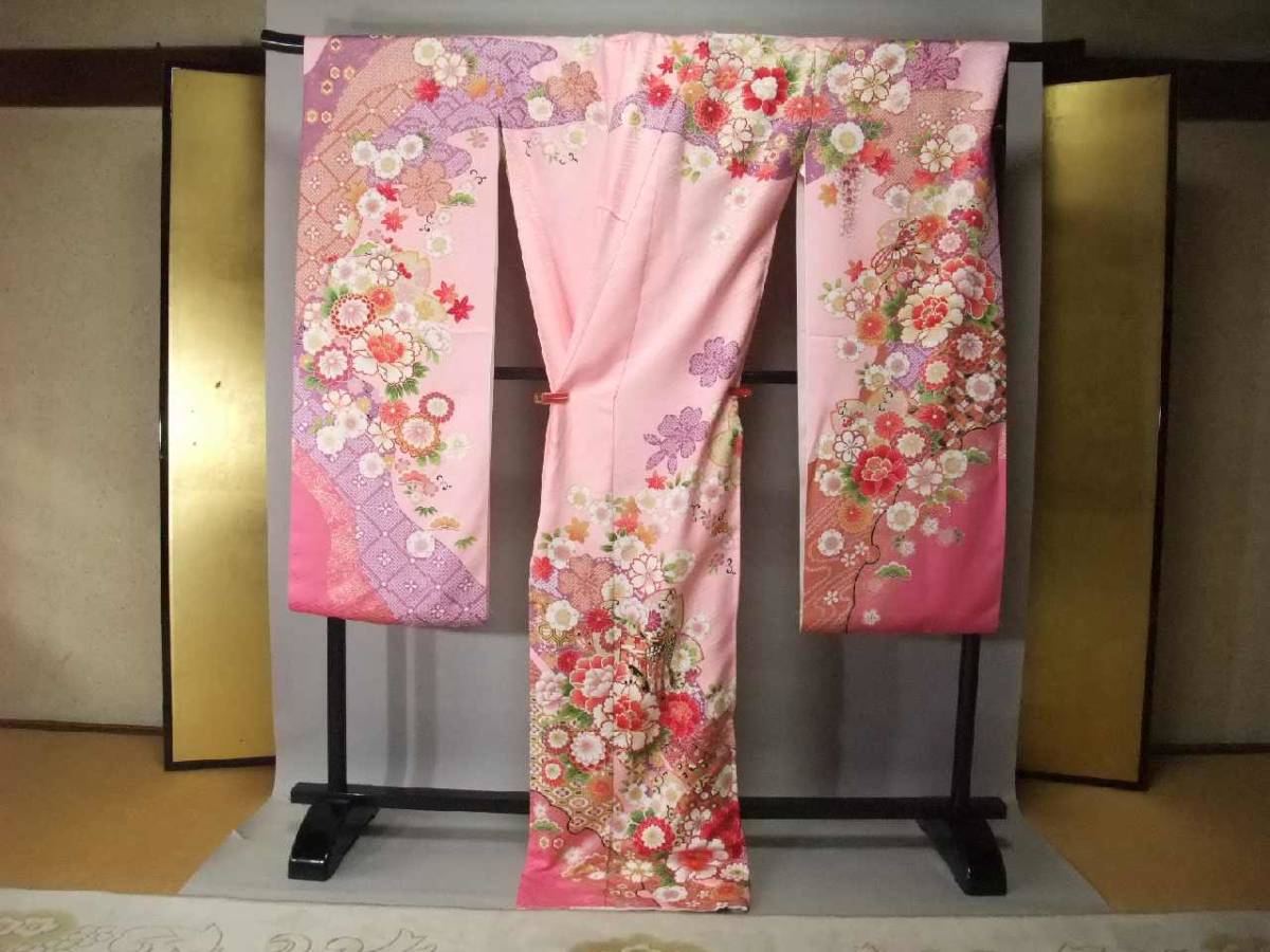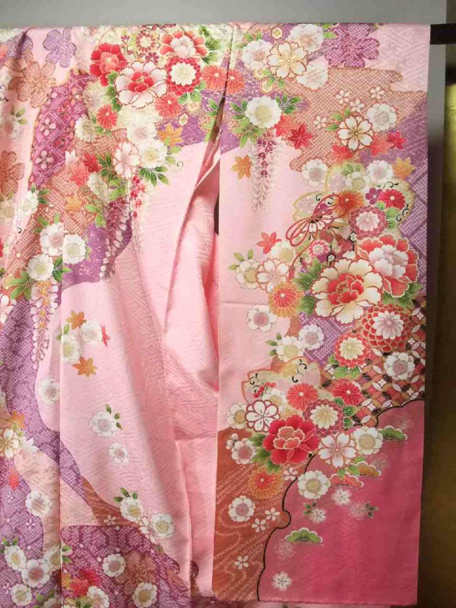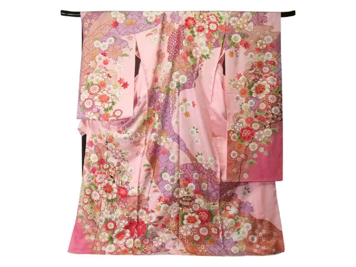 おしゃれなピンク地を基調に型と金彩の京友禅で