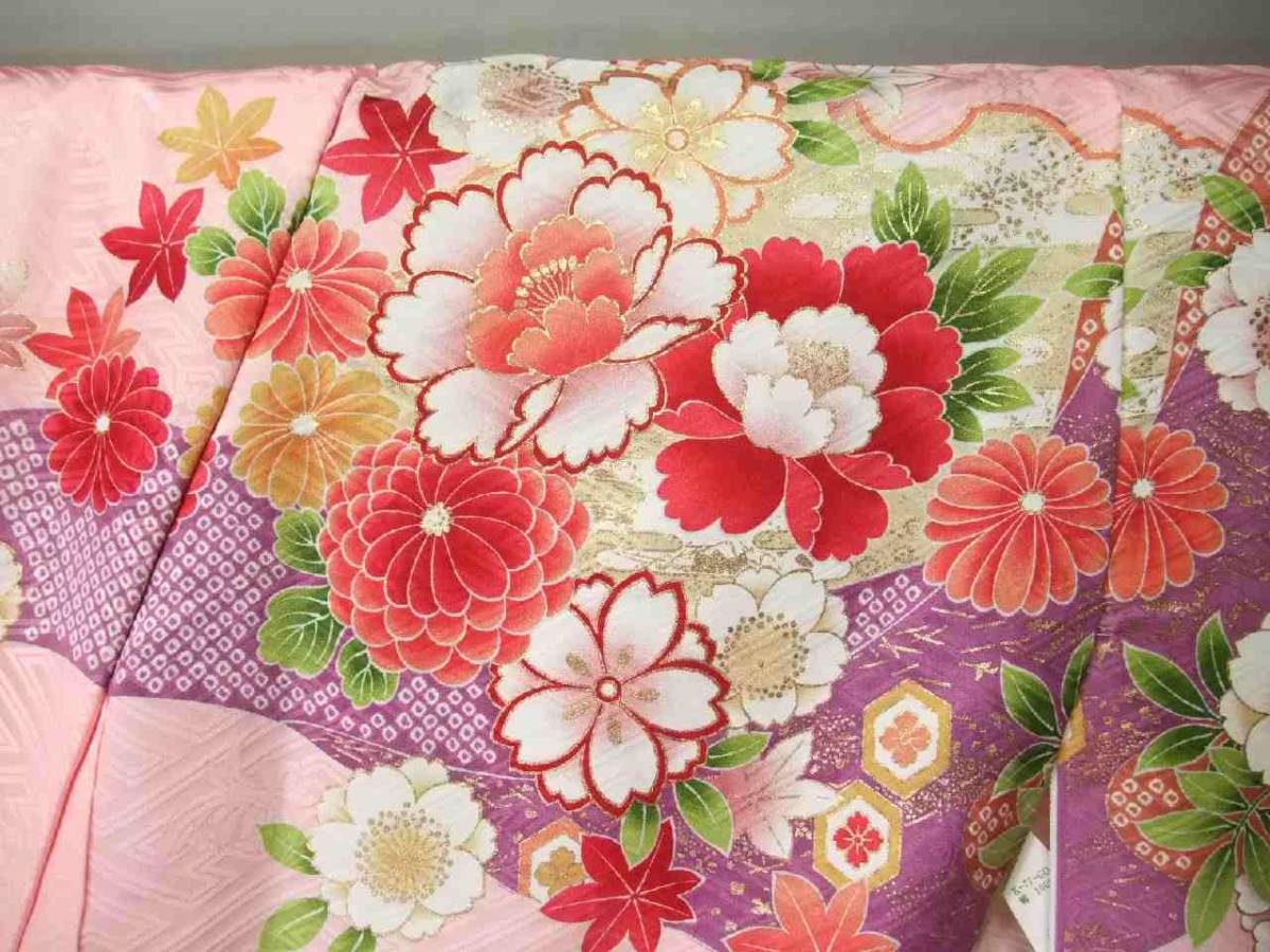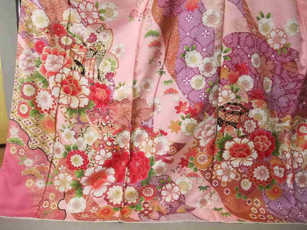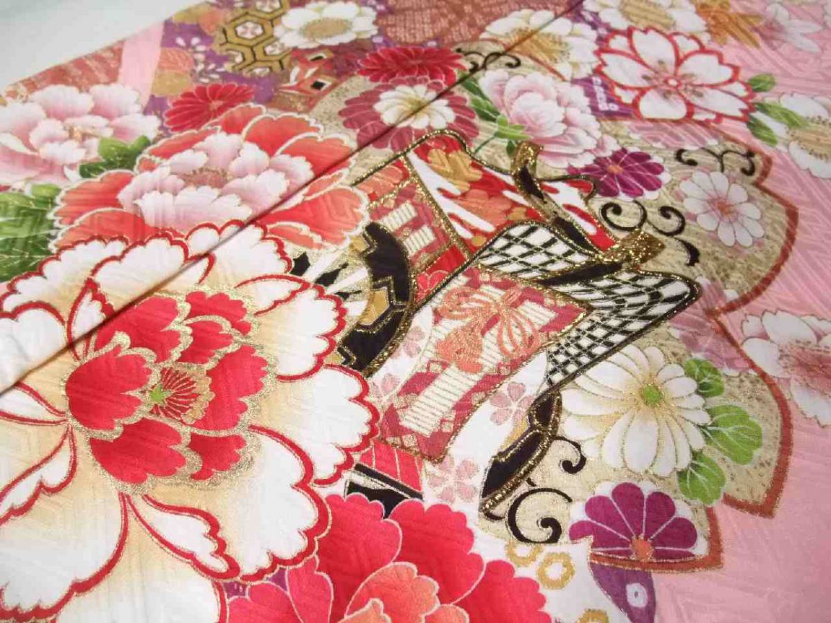 おしゃれなピンク地を基調に型と金彩の京友禅で