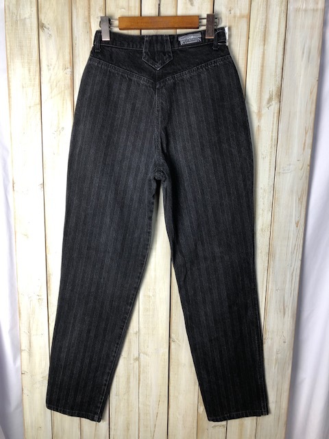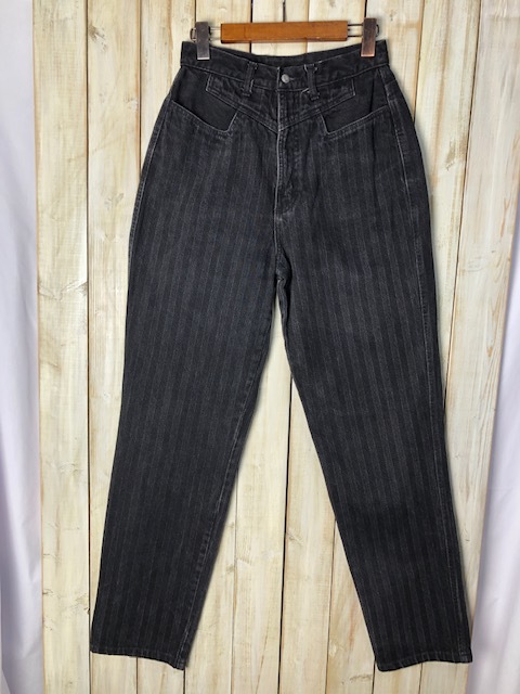●商品説明・・・アメリカ買い付け品になります。80年代~90年代頃のオールドの同系色の太いヘリンボーンというか太いヒッコリーのようなストライプ柄のブラックデニムパンツです。股上深めのゆったりしたワイドな太腿周りから裾にかけてテーパードしたややふっくら丸みのあるシルエット感です。ヨーク部分の独特なデザインがアクセントになっています。オールドのしっかりしたオンスのデニム生地です。色はブラック(黒)で、いい感じにフェード感が出てきています。こちらはユニセックスのような作りで、ウエストサイズでメンズ・レディースを分けますが、ウエストが合えば男女問わず履いていただけるパンツです。