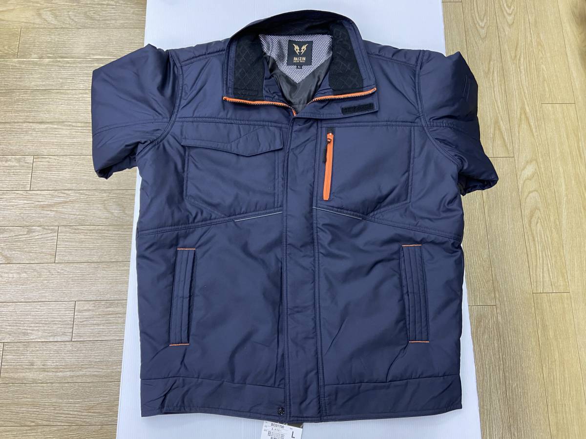 ★訳あり、激安!サンエス雷神服!ネイビー Lサイズ 寒さ対策に!仕事.釣り.レジャー等に♪ 面状発熱体が、背中、腰回りを温めてくれる!