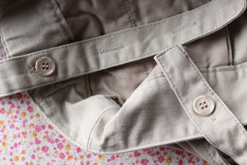 サスペンダーはボタンで長さ調節可能で、ボタンホールは3つあります。(10cm程度長さ調節できます。)
