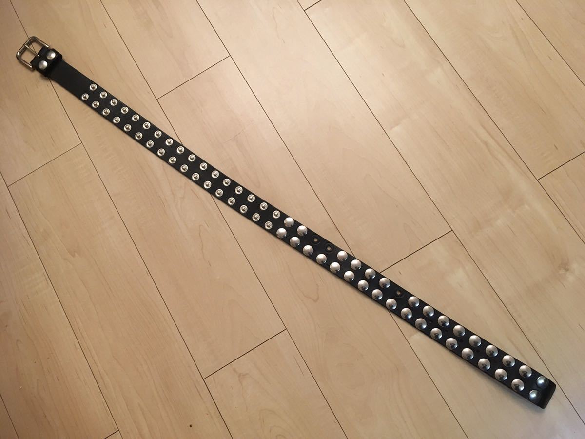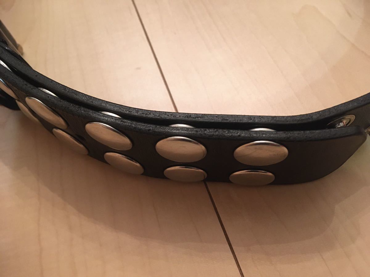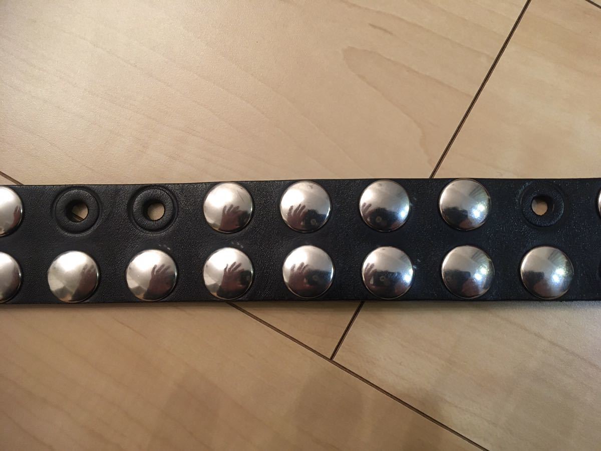 レザー、スタッズに若干の傷、革に皺が見られますがまだ硬さがあり美品です。三つスタッズが外れています。市販品のスナップボタンを付けようと思っていましたがそのまま放置です。