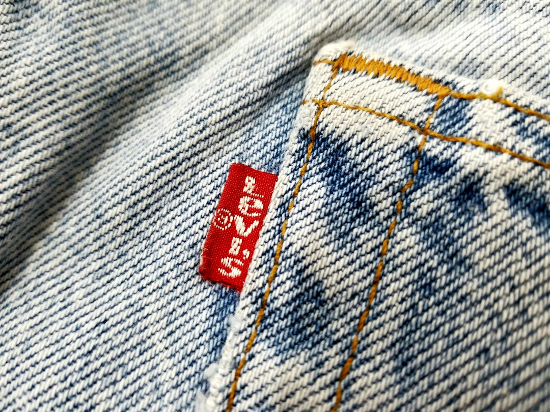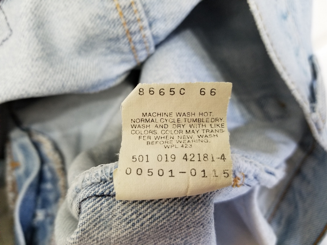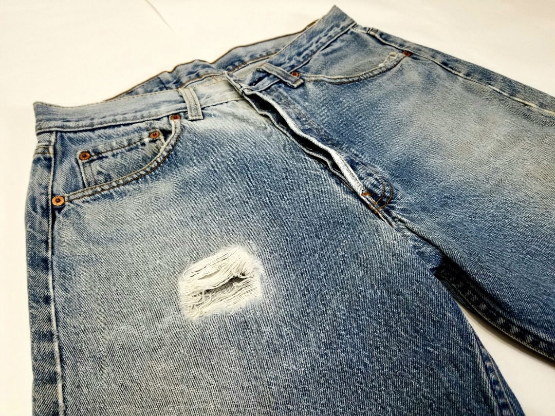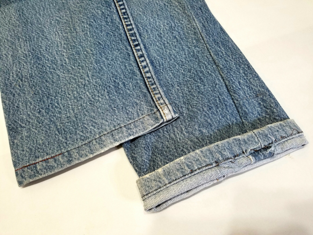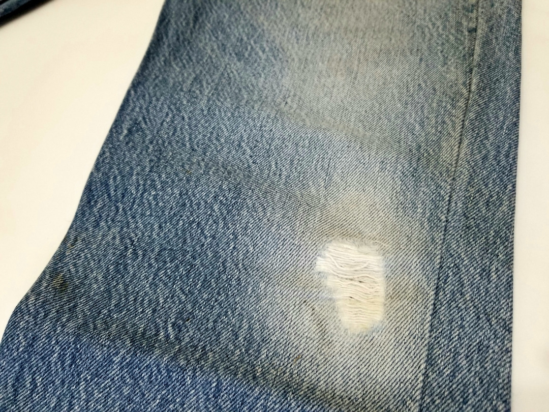 程よいインディゴ残りの右モモと左膝のクラッシュが雰囲気ある一着で、トップボタン裏501で、裾に向かってテーパードカスタムが施されています。