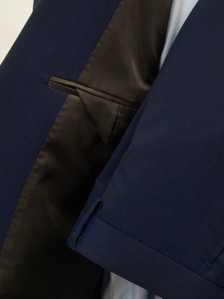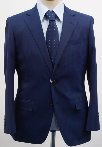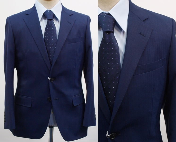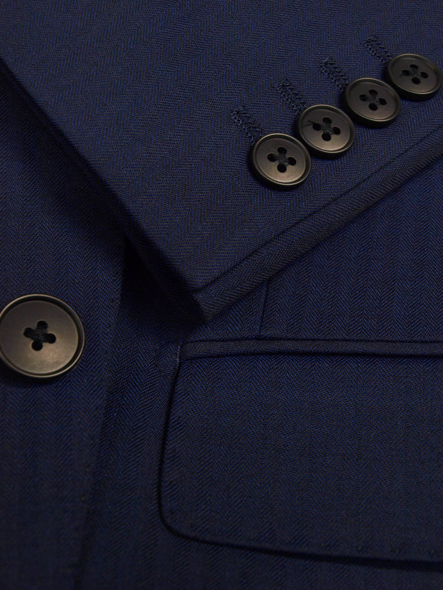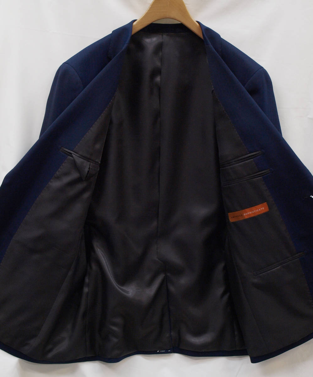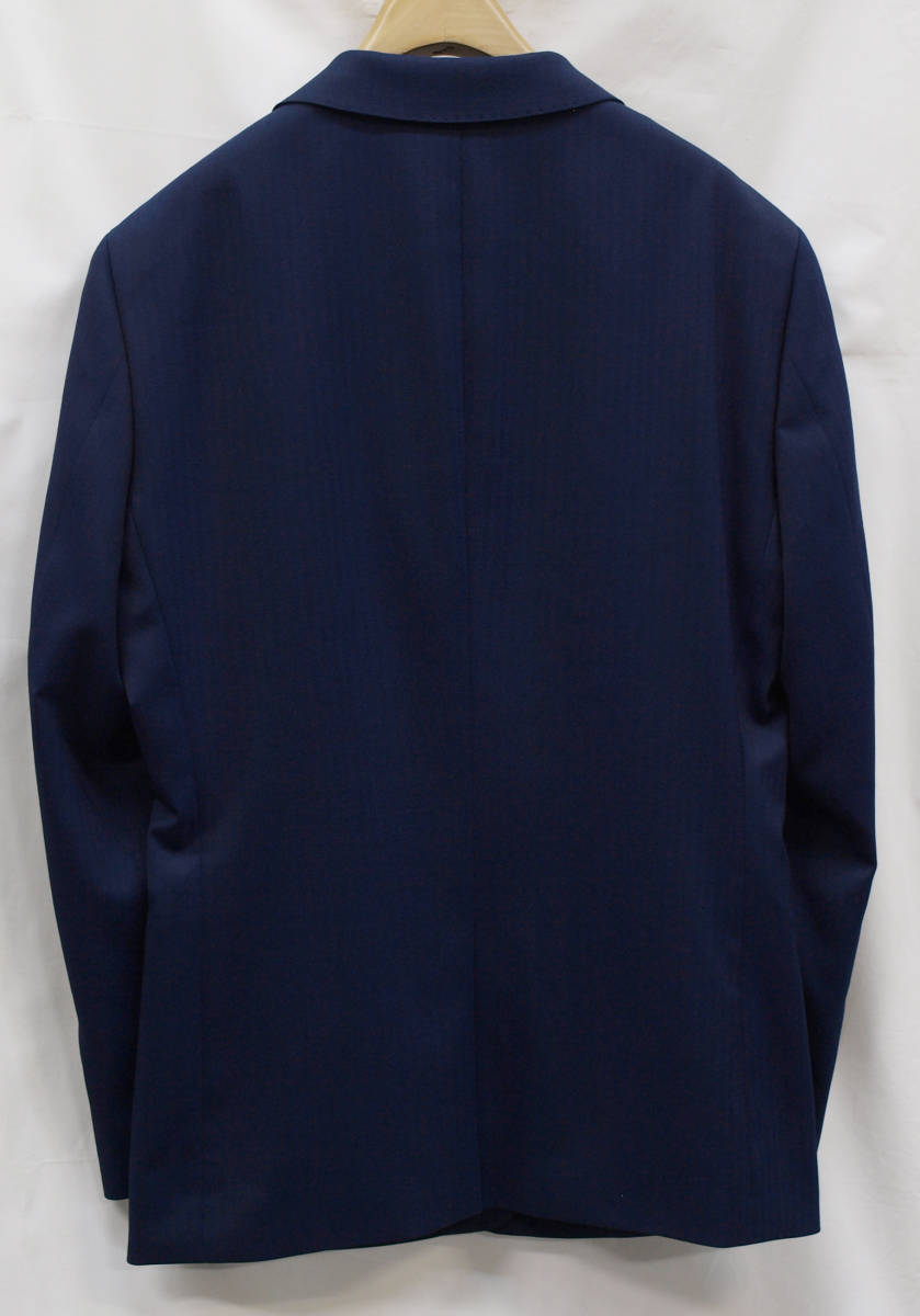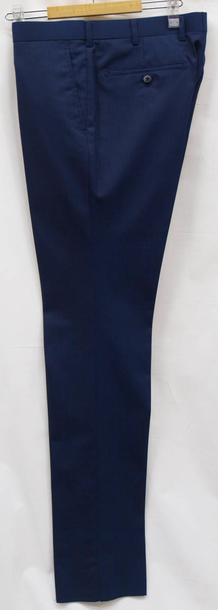 【サイズ】 BB4 (BBS BE4 サイズ相当) 目安の体型 身長160cm~170cm、ウエストサイズ92cm前後 【ジャケット実寸】 肩幅47cm 着丈66.5cm 袖丈58cm 脇下部分53cm 身幅48.5cm 【パンツ実寸】 ウエスト(胴回り実寸)92cm (平置きでかるくはかると92cmでひっぱってはかると94cmです。股上が浅いため2~3cmほど実寸が大きくなります。) わたり幅32.5cm(股下10cmの部位で28.5cm) 裾幅20cm 脇股上23.5cm 前股上26cm 股下88cm(裾上げしていない状態/新品) 【素材】 表地:ウール33% ポリエステル64% ポリウレタン3% 裏地:胴裏/ポリエステル100% 袖裏/ポリエステル100% 秋冬スーツの中ではあまり厚手ではない秋冬向け紳士スーツ用ウールブレンド素材です。 【色】 紺色 【柄】 シャドウストライプ織柄 【デザイン】 コンパクトな印象の細身ですっきりとしたシルエット、タイトフィットスリムスーツ新品、裾上げしていない状態です。 ジャケット:肩パットがはいっておらず軽い着心地のシングル2つボタン、細いシルエットのスリムモデル パンツ:股上は浅く細身シルエットのノータックスリムテーパードパンツ 秋冬商材ですが、それほど厚手ではない素材でご着用の地域にもよりますが夏を除くほぼオールシーズン対応商品です。 【縫製仕様】 ・ジャケットはシングル2つボタン、ノッチドラペル、襟縁等AMFステッチ入り、袖口ボタン4つ、センターベント、内ポケット4つ(小ポケット2つ含む)、総裏(秋冬春物) ・パンツはノータック、膝裏当て付き、脇ポケット斜め付け、後ろポケット両玉縁で左のみボタン付き、フロントはファスナーでボタン&ホック仕様/うちかけボタンあり、 細部にわたりきちんとしたビジネス仕様のきれいな縫製仕立てで仕上がっております。