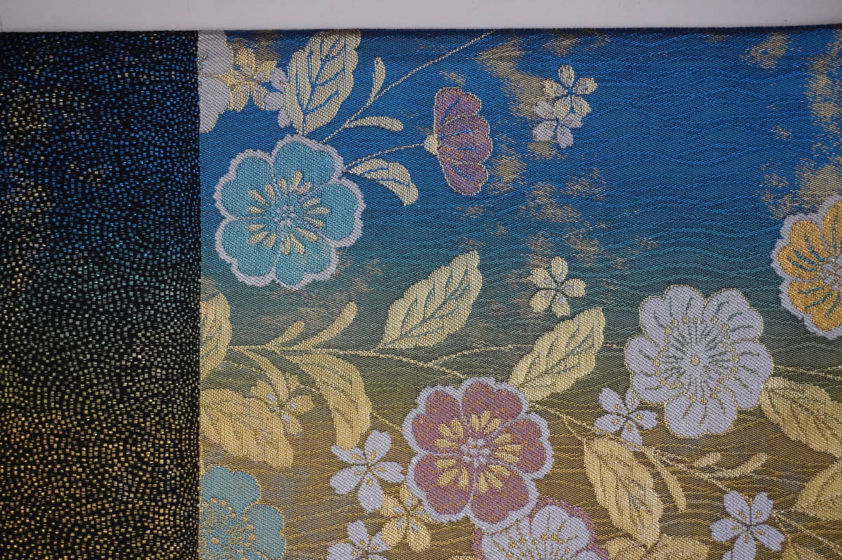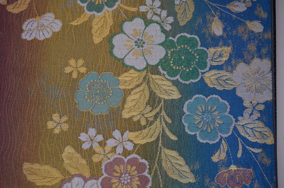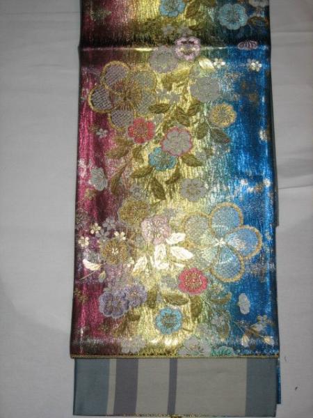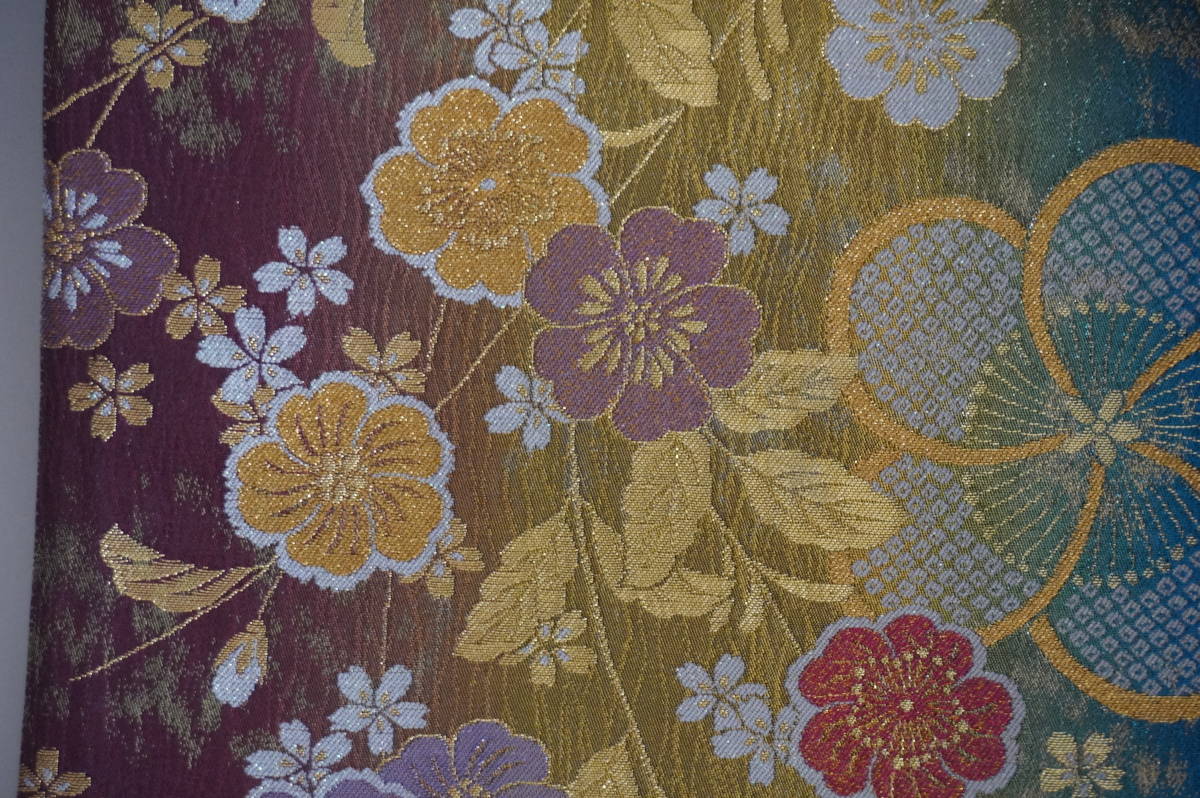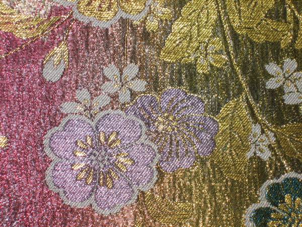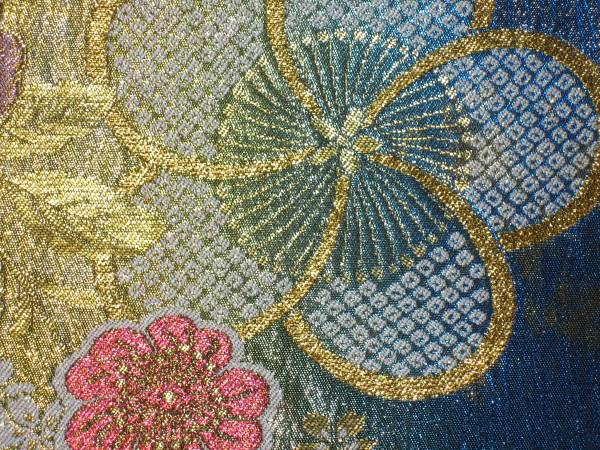 なお、帯柄左上に無地で出ているところは裏無地で、柄と柄の間に出ているところは手先と前太鼓のあいだの無地部分です。六通柄です。金銀糸が多用されているためストロボの照りで、しろぽく写っている部分があります。