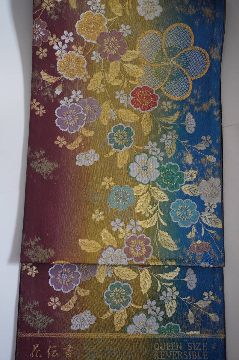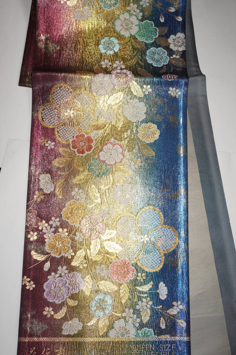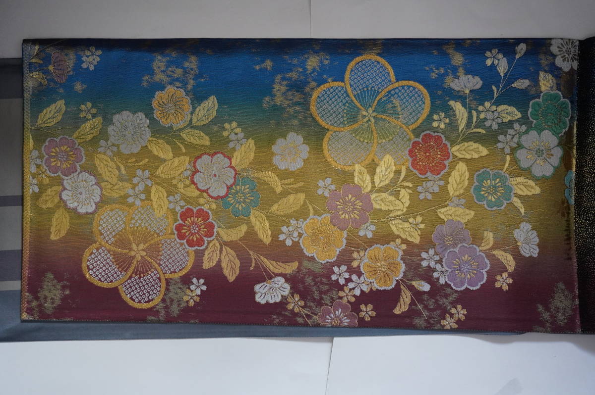 なお、帯柄左上に無地で出ているところは裏無地で、柄と柄の間に出ているところは手先と前太鼓のあいだの無地部分です。六通柄です。金銀糸が多用されているためストロボの照りで、しろぽく写っている部分があります。