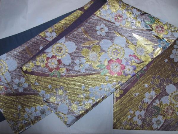 なお、帯柄左上に無地で出ているところは裏無地で、柄と柄の間に出ているところは手先と前太鼓のあいだの無地部分です。六通柄です。金銀糸が多用されているためストロボの照りで、しろぽく写っている部分があります。