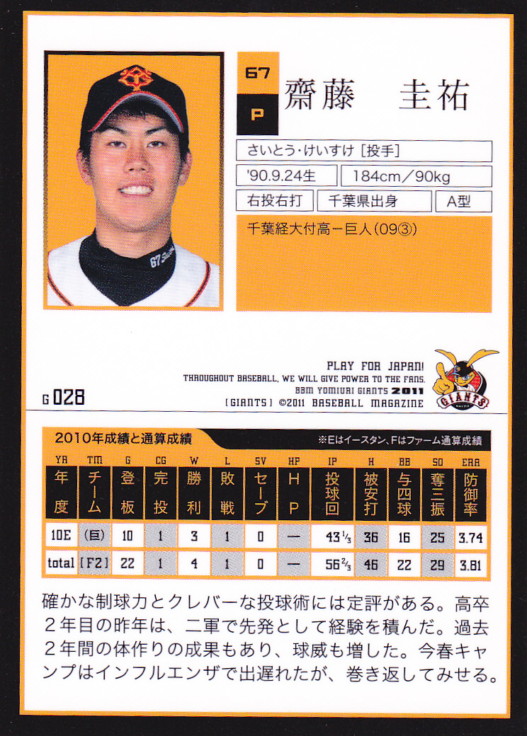 BBM2011読売ジャイアンツ G028 齋藤圭祐 千葉県 千葉経大付属高校 千葉経済大学附属高校 巨人
