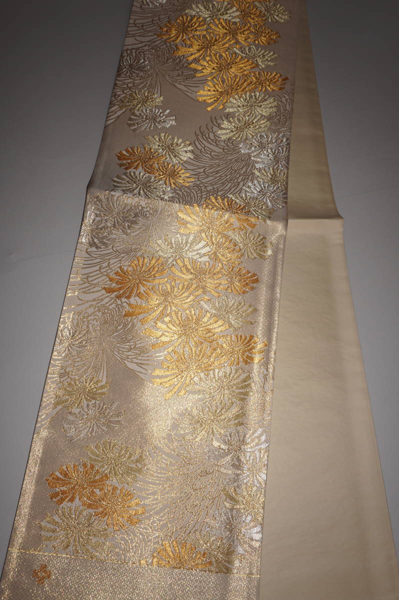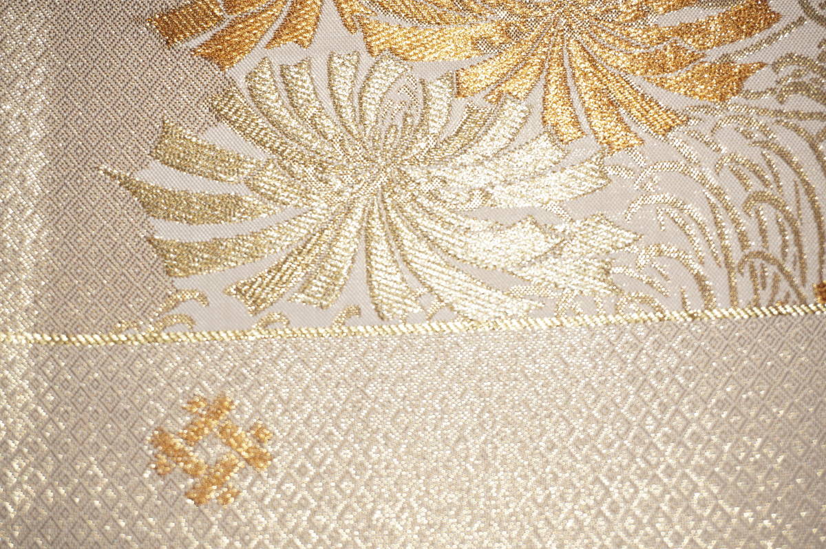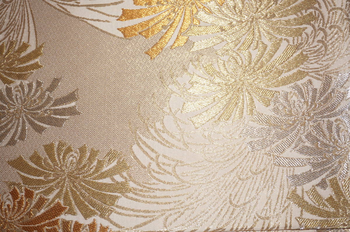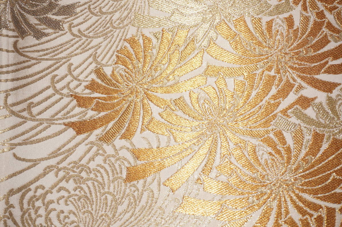 見たところ裏地絹100%表地横糸絹100%に金属糸で菊 経糸2~3本に1本の割合で絹糸あとは金属糸