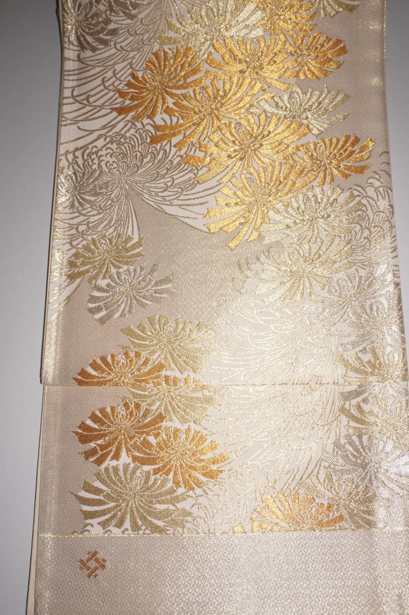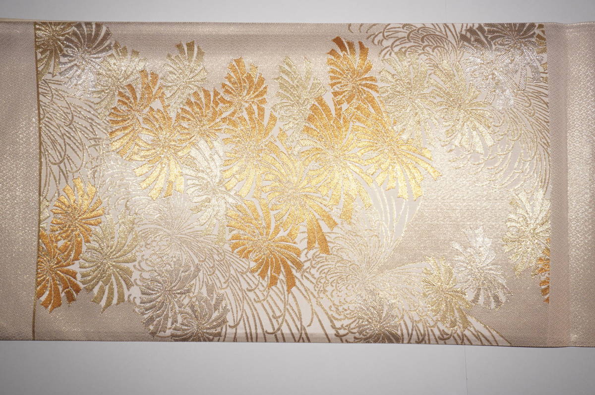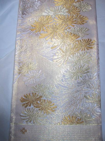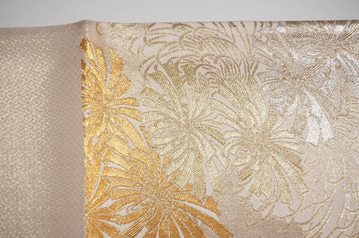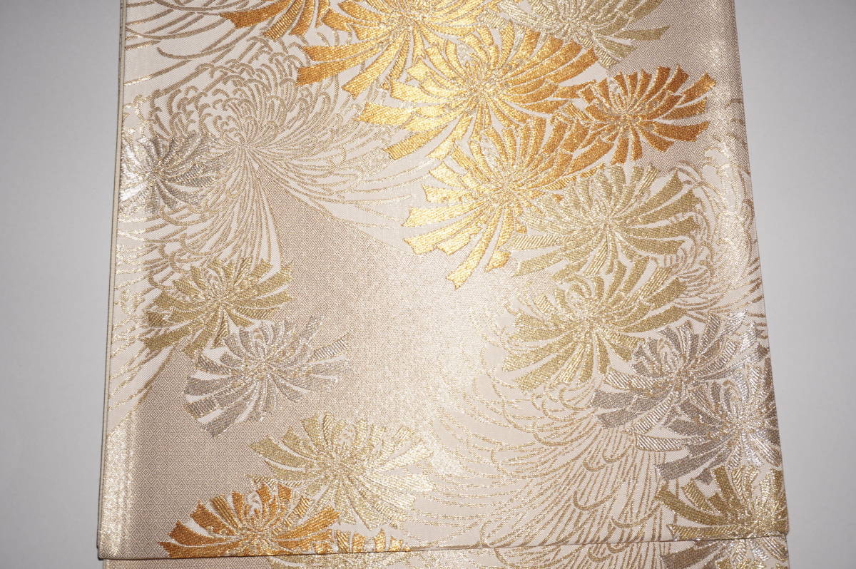 見たところ裏地絹100%表地横糸絹100%に金属糸で菊 経糸2~3本に1本の割合で絹糸あとは金属糸