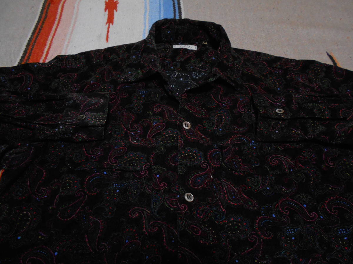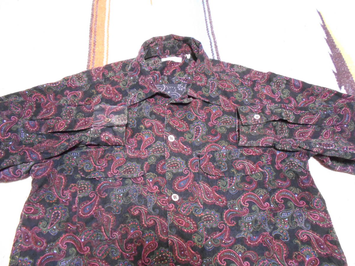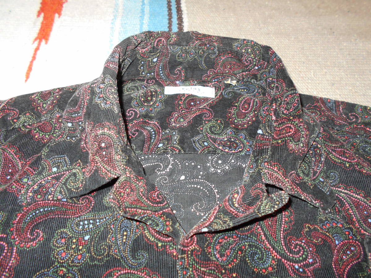 肌触り良く丈夫なきめ細かいコットン100%コーデュロイ素材感、絶妙な発色のサイケなペイズリー総柄、ルーズすぎない絶妙なシルエット、開襟ネック、クラシックフラップ付きのチェストポケット、等等...細部まで凝った仕立ての風合いの良さ