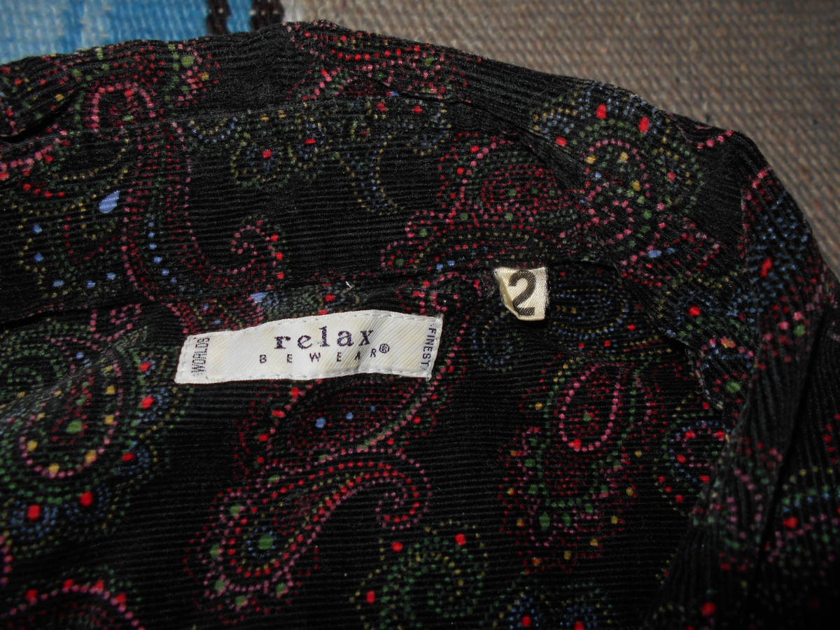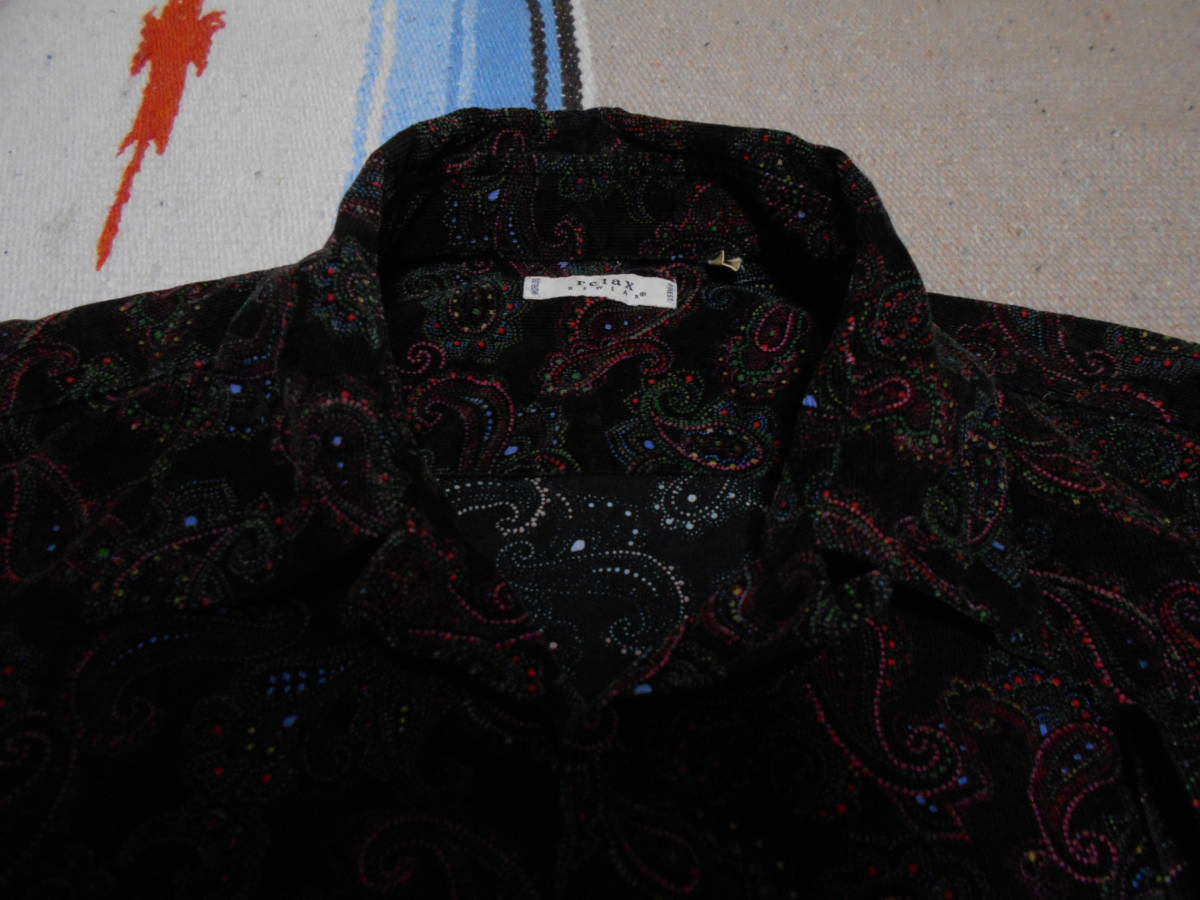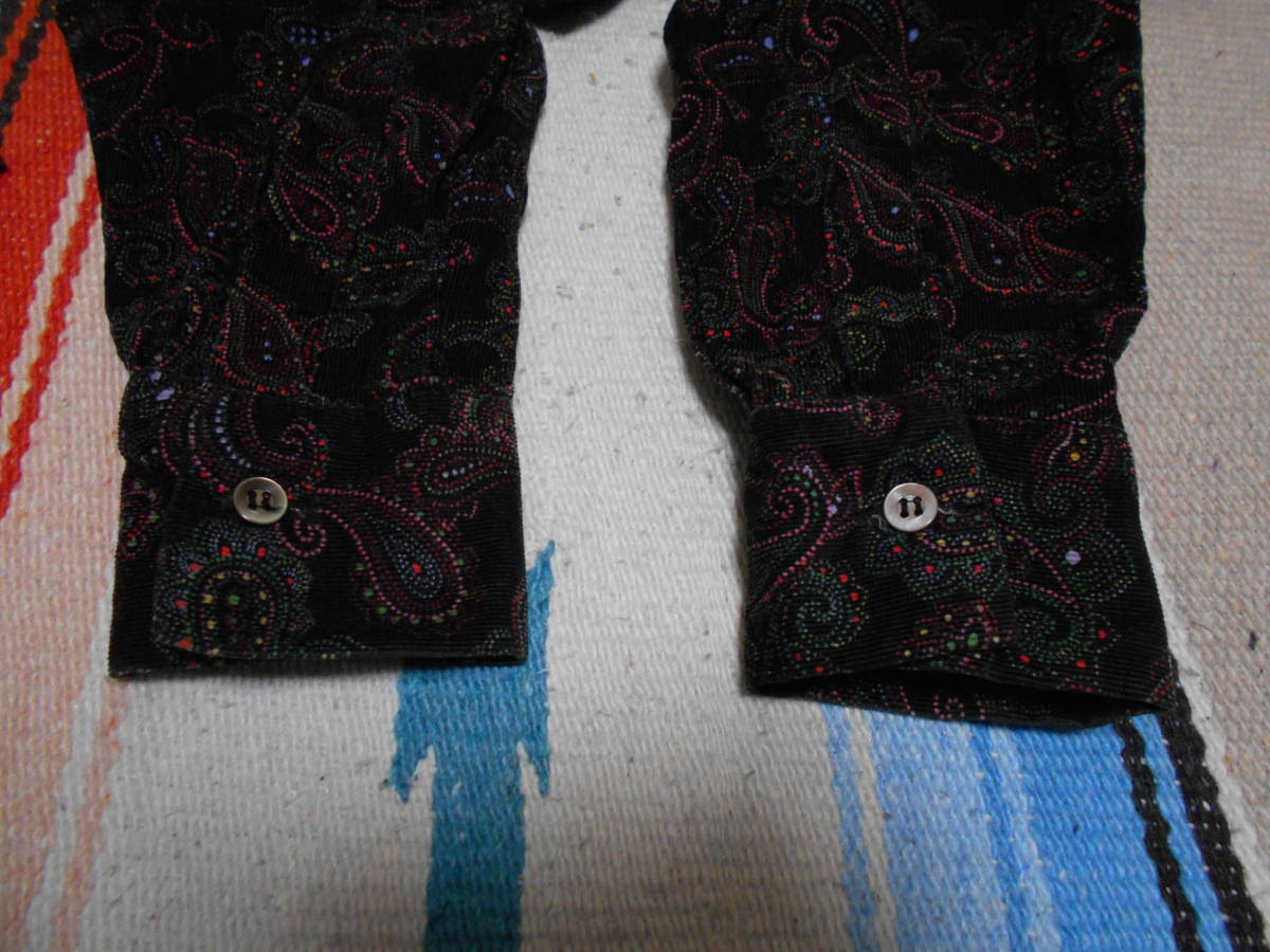 肌触り良く丈夫なきめ細かいコットン100%コーデュロイ素材感、絶妙な発色のサイケなペイズリー総柄、ルーズすぎない絶妙なシルエット、開襟ネック、クラシックフラップ付きのチェストポケット、等等...細部まで凝った仕立ての風合いの良さ