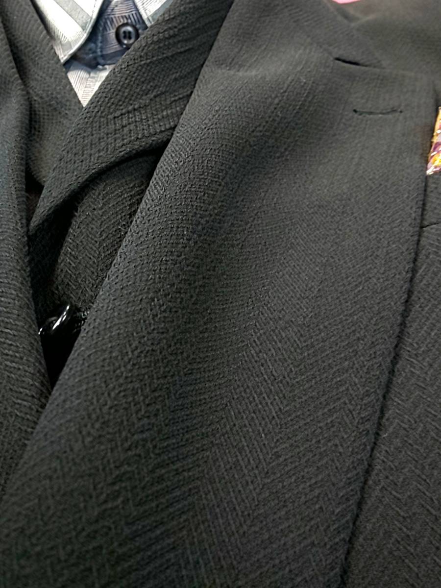 特徴    少し薄手のサラッとした生地でオシャレなヘリンボーン風ジャガード織り柄のスリーピースのWスーツです。