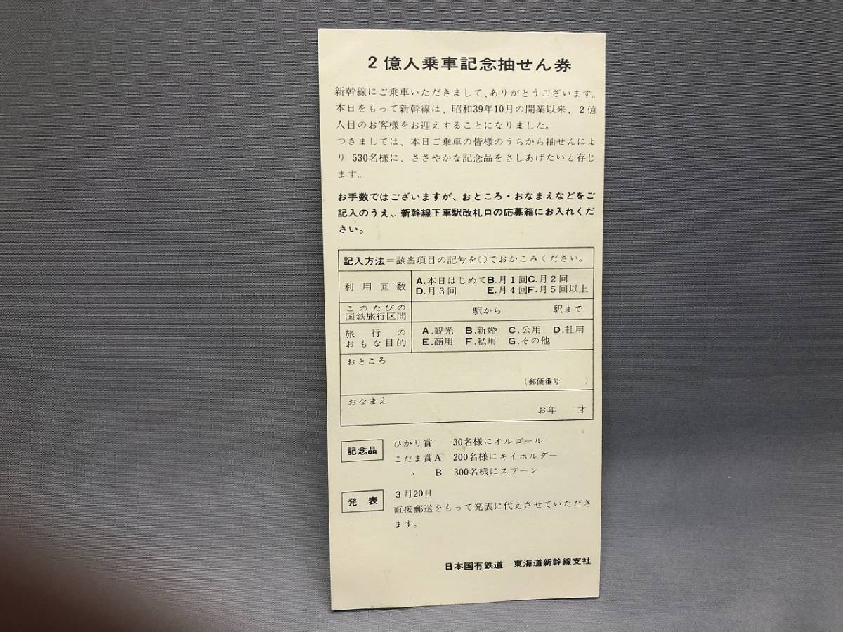 東海道新幹線支社 2億人乗車記念券・抽選券 1969年 【K2-15】