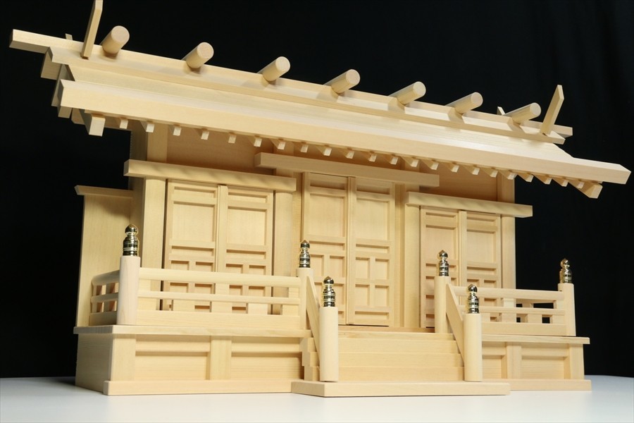 美しい木肌、目の詰まった年輪と柾目、最高級の木曽桧材(尾州桧)から作られる神棚。神棚職人が心を込めて細部まで仕上げています。 ご家庭から会社・事務所でのお祀りに最適なサイズ、大型の三社宮ですが高さを抑えた「低床型」と呼ばれる構造。高さの限られたスペースにも設置ができます。また外観的にも圧迫感なく収まり、上品でシンプルなデザイン。「唐戸扉」と呼ばれる細微な木工加工が施された、手の込んたお社です。扉の奥は切込みがあり、大きなお神札もお納めできます。 高級材の風合いをたっぷりと演出する、真鍮金具の少ないお社は(擬宝珠のみ)洋風のお部屋にもなじみやすいモダン調。質の高い職人手作りの神棚をお探しの方にもお勧めです。 | |||