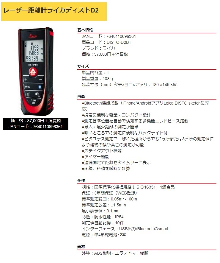 タジマレーザー距離計ライカディストD2商品コード:DISTO-D2BTブランド:ライカ