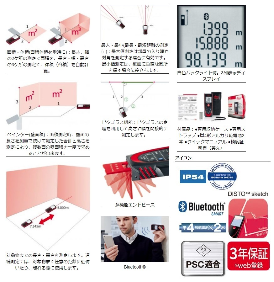 ・面積、容積を瞬時に計算能搭載(iPhone/AndroidアプリLeica DISTO sketchに対応)